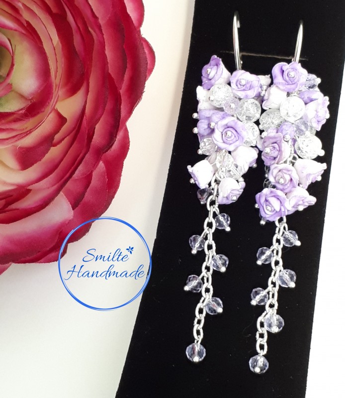 Rankų darbo auskarai pagaminti iš polimerinio molio bei stiklo kristalų. Auskarų ilgis su užsegimu 9 cm