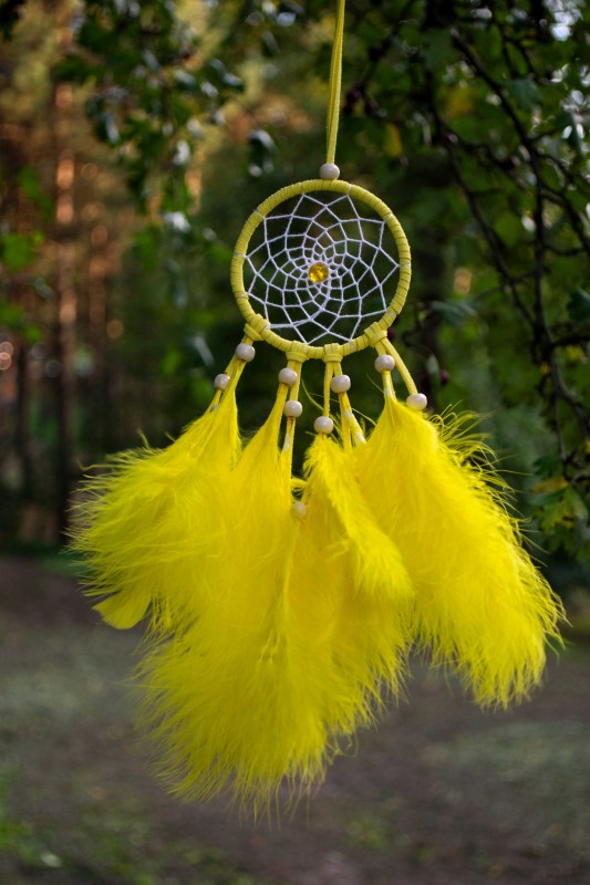 Nedidelė rankų darbo geltona sapnų gaudyklė