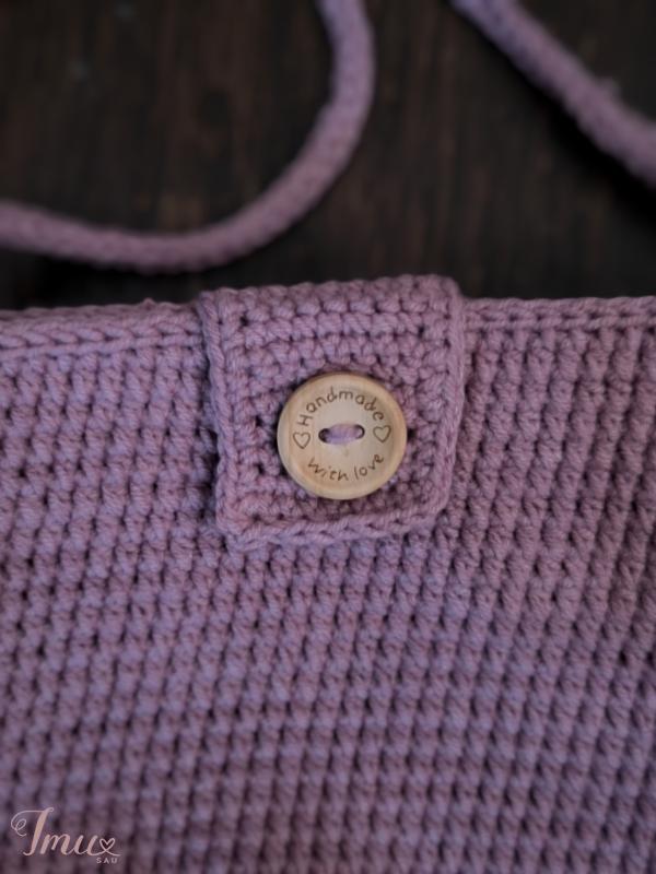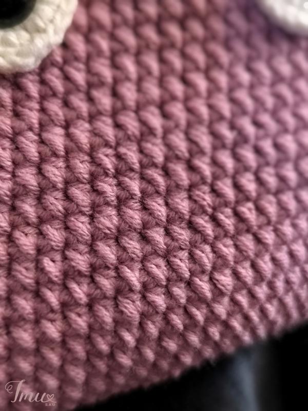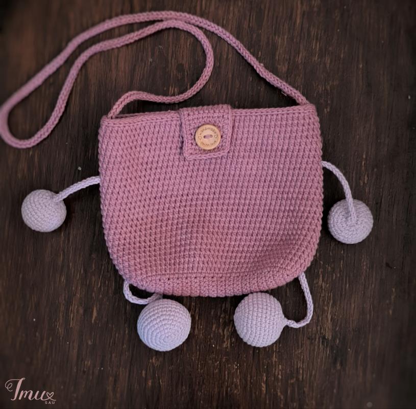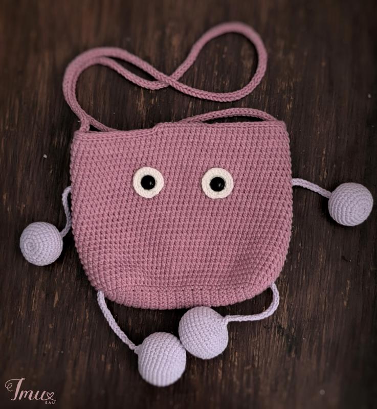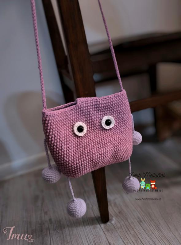 Rankų darbo nertas rankinukas. Patempus už kojitės, trumpėja rankitė. Tiks ne tik daiktams susidėti,bet ir bus antistresinių žaislų. Užsegimas - sagą. Tinka 4-10m. vaikams. Dydis: 18cm×16cm, rankena 34cm ramybės būsenoje. Sudėtis: 55% medvilnė, 45% akrilikas, plastikinės akis su saugių užsegimų. Spalvos: pelenų rožė, pieno balta, alyvinė spalvos.