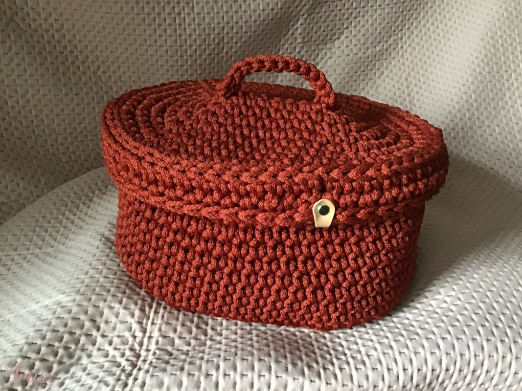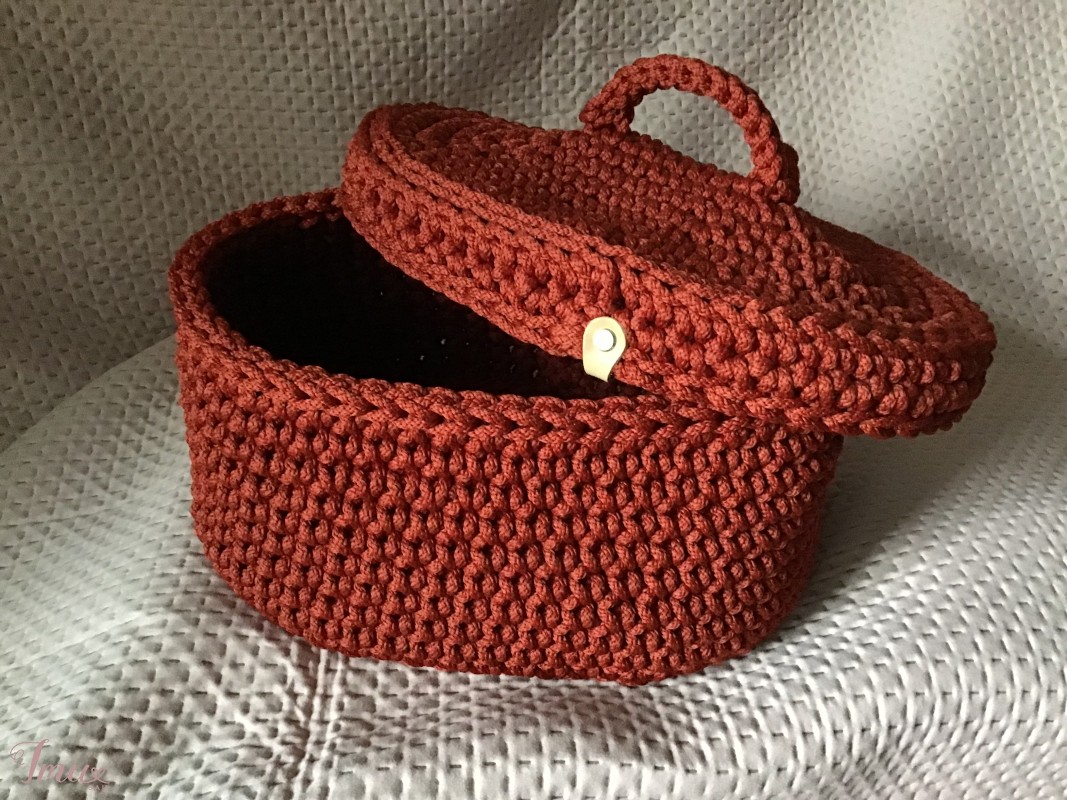 Parduodamas kruopščiai iš sintetinės virvės nertas krepšys su dangčiu. Terakotos spalvos, standus, laikantis formą, lengvai prižiūrimas. Gali būti naudojamas pvz.: siuvimo ar mezgimo reikmenims susidėti, vonios reikmenims, vaiko žaislams ir t.t. Krepšio pagrindas - ovalas ~ 23x32 cm. Aukštis -17 cm. Krepšys yra Vilniuje, į kitus miestus siunčiu OMNIVA (+ siuntimo išlaidos).