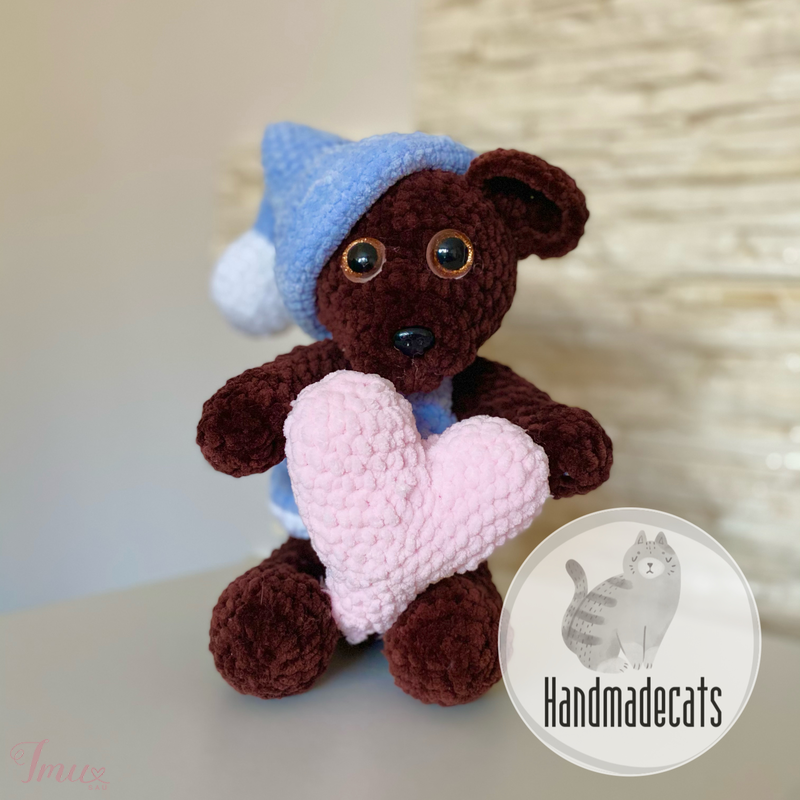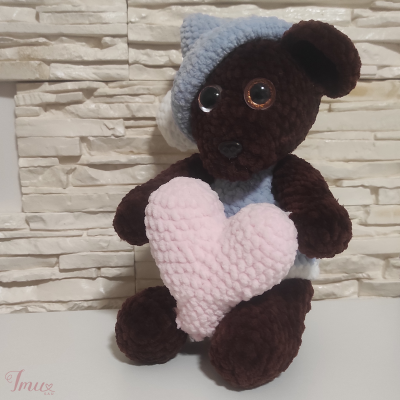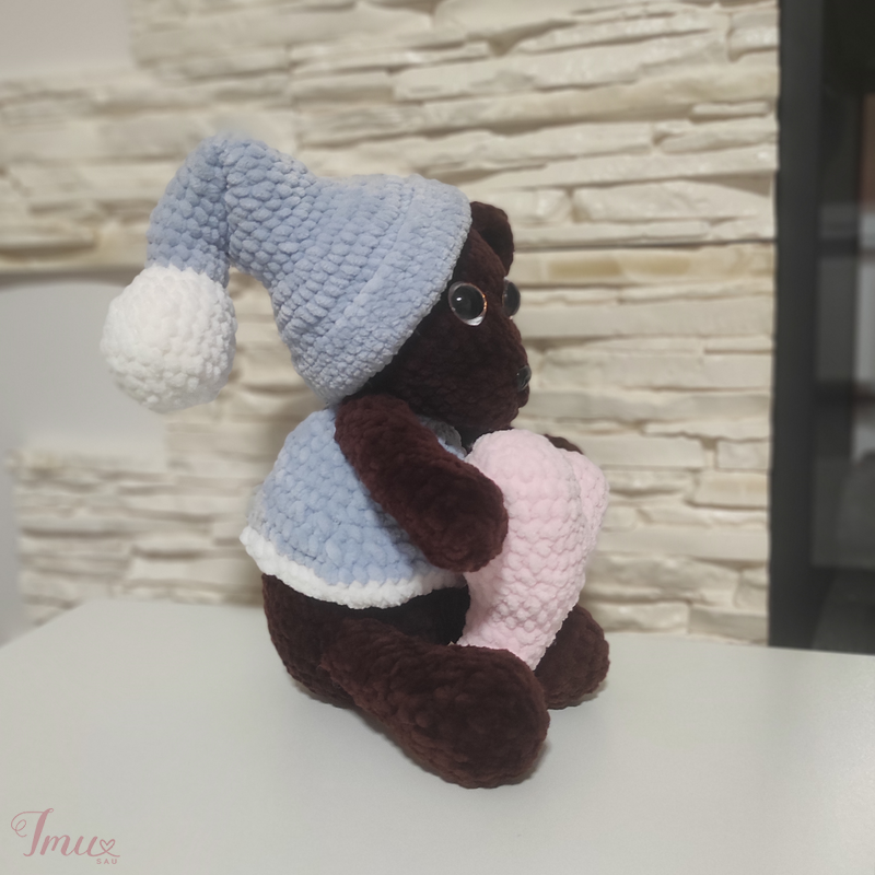 Nertas, ranku darbo pliušinis meškiukas, su pižama ir širdute. Dydis: 28X17 cm. Siulai: HIMALAYA DOLPHIN BABY.