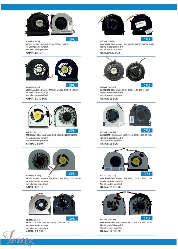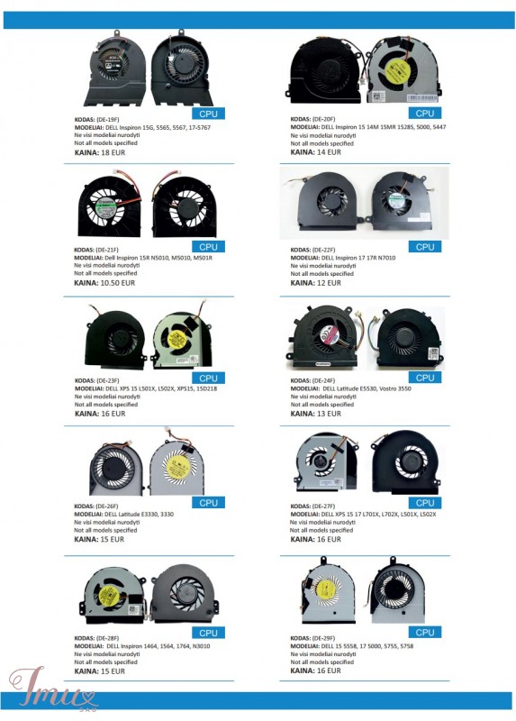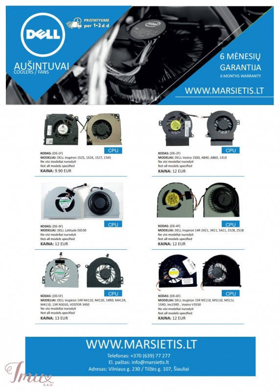 Nešiojamųjų kompiuterių DELL aušintuvai, ventiliatoriai PIGIAUSIAI! Pristatymas visoje Lietuvoje per 1–2 dienas. Visiems ventiliatoriams suteikiame garantiją. Padėsime išsirinkti ir sumontuosime. Jei nerandate tinkamo modelio, klauskite, rasime sprendimą. www.marsietis.lt info@marsietis.lt 863977277 Vilniaus 230, Šiauliai WWW.MARSIETIS.LT prekiauja įvairių modelių nešiojamųjų kompiuterių ventiliatoriais, aušintuvais VISOJE Lietuvje. DELL INSPIRON 1525, 1526, 1527, 1545, 1546 aušintuvas/ventiliatorius KAINA 9.90 EUR. DELL VOSTRO 1500, A840, A860, 1410 aušintuvas/ventiliatorius KAINA 12 EUR. DELL Latitude E6530 aušintuvas/ventiliatorius KAINA 12 EUR. DELL Inspiron 14R 2421, 3421, 5421, 2528, 2518, 5437, 2328, 2421, Latitude 3440 aušintuvas/ventiliatorius KAINA 12 EUR. DELL Inspiron 14R N4110, N4120, 14RD, M411R, M4110, 13R N3010 aušintuvas/ventiliatorius KAINA 13 EUR. DELL Inspiron 15R N5110, M5110, M511r, 15RD aušintuvas/ventiliatorius KAINA 12 EUR. DELL Latitude 5520, E5520, E5520N, E5520M aušintuvas/ventiliatorius KAINA 13 EUR. DELL INSPIRON 14V M4010, N4020, N4030 aušintuvas/ventiliatorius KAINA 9.90 EUR. DELL Inspiron M5030, M5020, M5010, N5030, N5020, N4010, N4020, N4030 aušintuvas/ventiliatorius KAINA 11.80 EUR. DELL Studio 1535, 1536, 1537, 1555, 1557, 1558, PP33L aušintuvas/ventiliatorius KAINA 13 EUR. DELL Inspiron M4040, M5040, N4050, N5040, N5050, V1450, 3420, 2420 aušintuvas/ventiliatorius KAINA 13 EUR. DELL VOSTRO 1014, 1015, 1018, 1088 aušintuvas/ventiliatorius KAINA 13 EUR. DELL Inspiron 15R 5520, 5525, 7520, 7520, Vostro V3560 aušintuvas/ventiliatorius KAINA 12 EUR. DELL Inspiron 15R 3521, 15-3521, 3537, 3721, 3737, 5521, 5537, 5721, 5735, 5737 aušintuvas/ventiliatorius KAINA 11.10 EUR. DELL Latitude E6400, E6410, E6510, Precision M2400 aušintuvas/ventiliatorius KAINA 13 EUR. DELL Vostro 3400, 3500, V3400, V3450, V3500 aušintuvas/ventiliatorius KAINA 14.50 EUR. Dell inspiron 15G 5565 5567 17-5767 aušintuvas/ventiliatorius KAINA 18 EUR. DELL Inspiron 15 14M 15MR 1528S, 5000, 5447, 5448, 5547, 5548, 1628S, 5543, 5545, 5542 aušintuvas/ventiliatorius KAINA 14 EUR. DELL Inspiron 15R N5010, M5010 aušintuvas/ventiliatorius KAINA 10.50 EUR. DELL Inspiron 17 17R N7010 aušintuvas/ventiliatorius KAINA 12 EUR. DELL XPS 15 L501X, L502X aušintuvas/ventiliatorius KAINA 16 EUR. DELL Latitude E5530, Vostro 3550 aušintuvas/ventiliatorius KAINA 13 EUR. Dell Latitude E3330 3330 02P18C 2P18C KDB0705HA aušintuvas/ventiliatorius KAINA 15 EUR. Dell XPS 17 L701X L702X GB0508PHV1-A aušintuvas/ventiliatorius KAINA 16 EUR. Dell Inspiron 1464 1564 1764 aušintuvas/ventiliatorius KAINA 15 EUR. Dell 15 5558 17 5000 5755 5758 Vostro 15 3558 DFS541105FC0T FG9V aušintuvas/ventiliatorius KAINA 16 EUR. Dell Inspiron 7560 Vostro 5468 V5568 Dell Inspiron 15 7560 15-7560 CPU Cooling Fan DC028000ICD0 0W0J85 aušintuvas/ventiliatorius KAINA 14 EUR. Dell Latitude 3590 E3590 Inspiron 15 5570 5575 aušintuvas/ventiliatorius KAINA 17 EUR. Dell Latitude E6500 M4400 aušintuvas/ventiliatorius KAINA 15 EUR. Dell Inspiron 14-3458 14-3468 3459 3558 aušintuvas/ventiliatorius KAINA 19 EUR. Dell Inspiron 15 7577“, „G7 15 7588 GPU+CPU aušintuvas/ventiliatorius KAINA 30 EUR. DELL XPS M1330 M1310 M1318 PP25L HR538 aušintuvas/ventiliatorius KAINA 17 EUR. Dell Inspiron 14-7460 7460 7472 P74G aušintuvas/ventiliatorius KAINA 19 EUR. Dell inspiron G3 G3-3579 3779 9556 G5 5587 3578 L+R aušintuvas/ventiliatorius KAINA 34 EUR. Dell E6420 aušintuvas/ventiliatorius KAINA 14 EUR. DELL Inspiron 15 5570 5575 I5575 P75F Vostro 15 3583 3584 aušintuvas/ventiliatorius KAINA 21 EUR. Dell XPS13 9343 9350 9360 CPU Cooling Fan 0XHT5V XHT5V DC28000F2F0 aušintuvas/ventiliatorius KAINA 17 EUR. Dell Inspiron 17R-SE 7720 17R 5720 MF75120V1-C100-G99 aušintuvas/ventiliatorius KAINA 25 EUR. Dell Latitude E7450 E7440 E7420 aušintuvas/ventiliatorius KAINA 17 EUR. Dell XPS 15-9530 15(9530) / Precision M3800 aušintuvas/ventiliatorius KAINA 22 EUR.