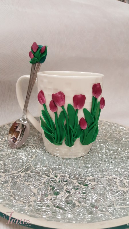 polimeriniu moliu dekoruotas puodelis su šaukšteliu siunčiu i kitus miestus
