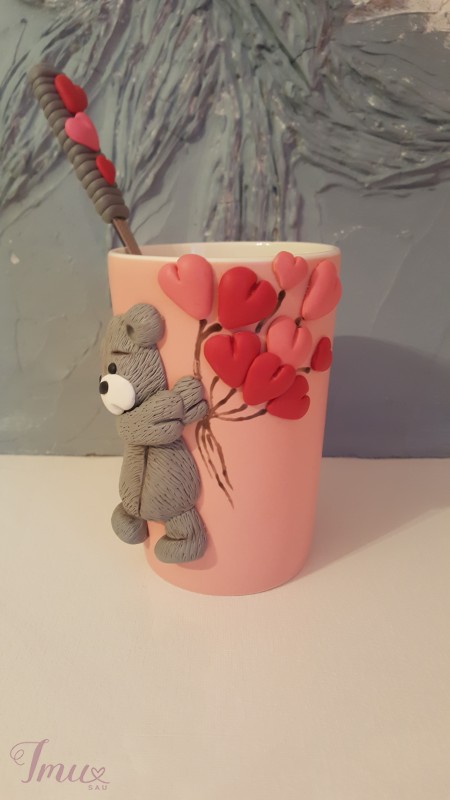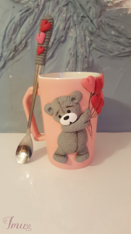 polimeriniu moliu dekoruotas puodelis su šaukšteliu siunčiu i kitus miestus