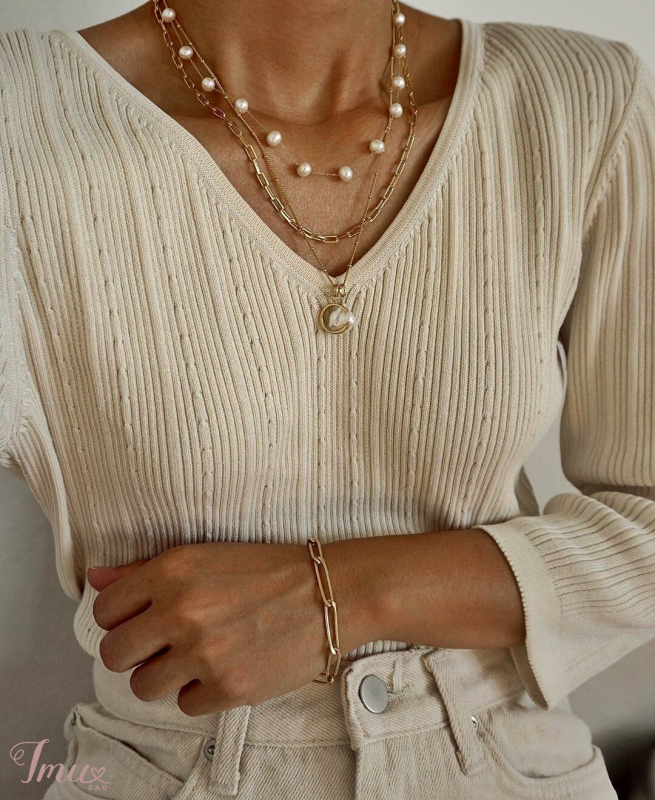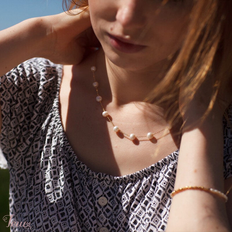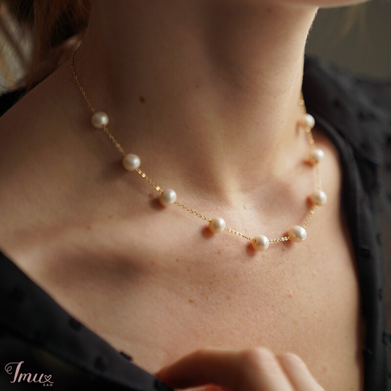Elegantiška paauksuota grandinėlė su natūraliais perlais. 7-8mm. Ilgis reguliuojamas nuo 40 iki 45 cm. Prekė supakuota į baltos spalvos, gražią, puošnią dėžutę.