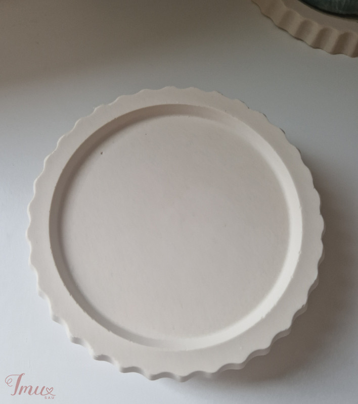 Rankų darbo, gipso padėkliukas. Bendras skersmuo 10,5 cm, vidinis 8,5cm. Puikiai tinka puodeliams, žvakėms ar aksesuarams pasidėti.