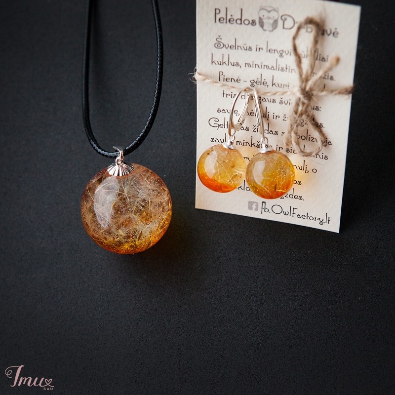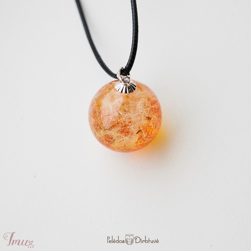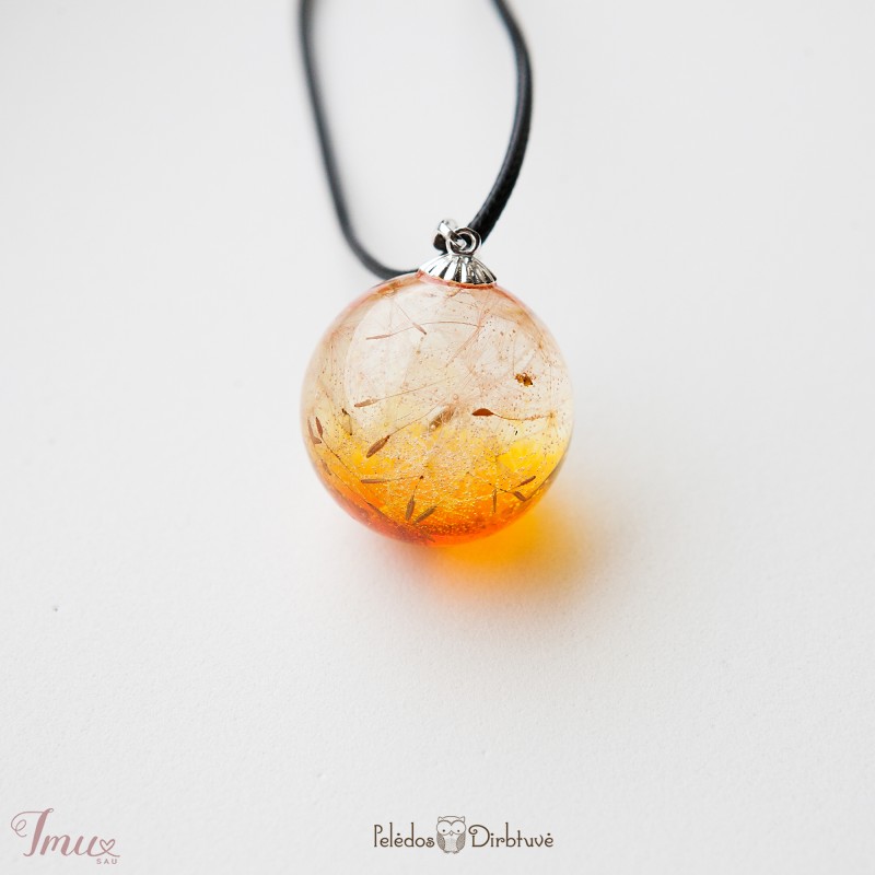 Pakabukas - 30mm; Laikiklis - sidabras; Tikri pūkeliai, aukštos kokybės juvelyrinė derva (nedūžta); Pienė atspindi tris dangaus šviesulius: saulę, mėnulį ir žvaigždes. Geltonas žiedas simbolizuoja saulę, minkštas ir sidabrinis pūkų rutulys - mėnulį, o skraidančios jos sėklos - žvaigždes.
