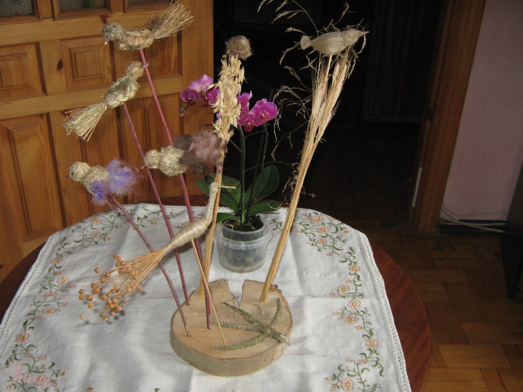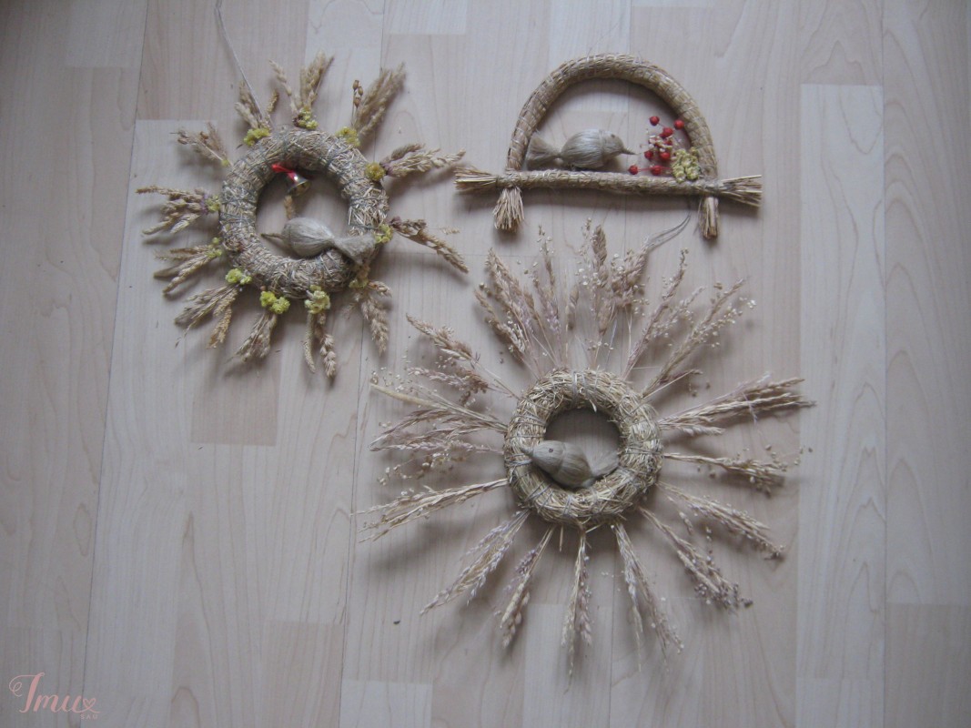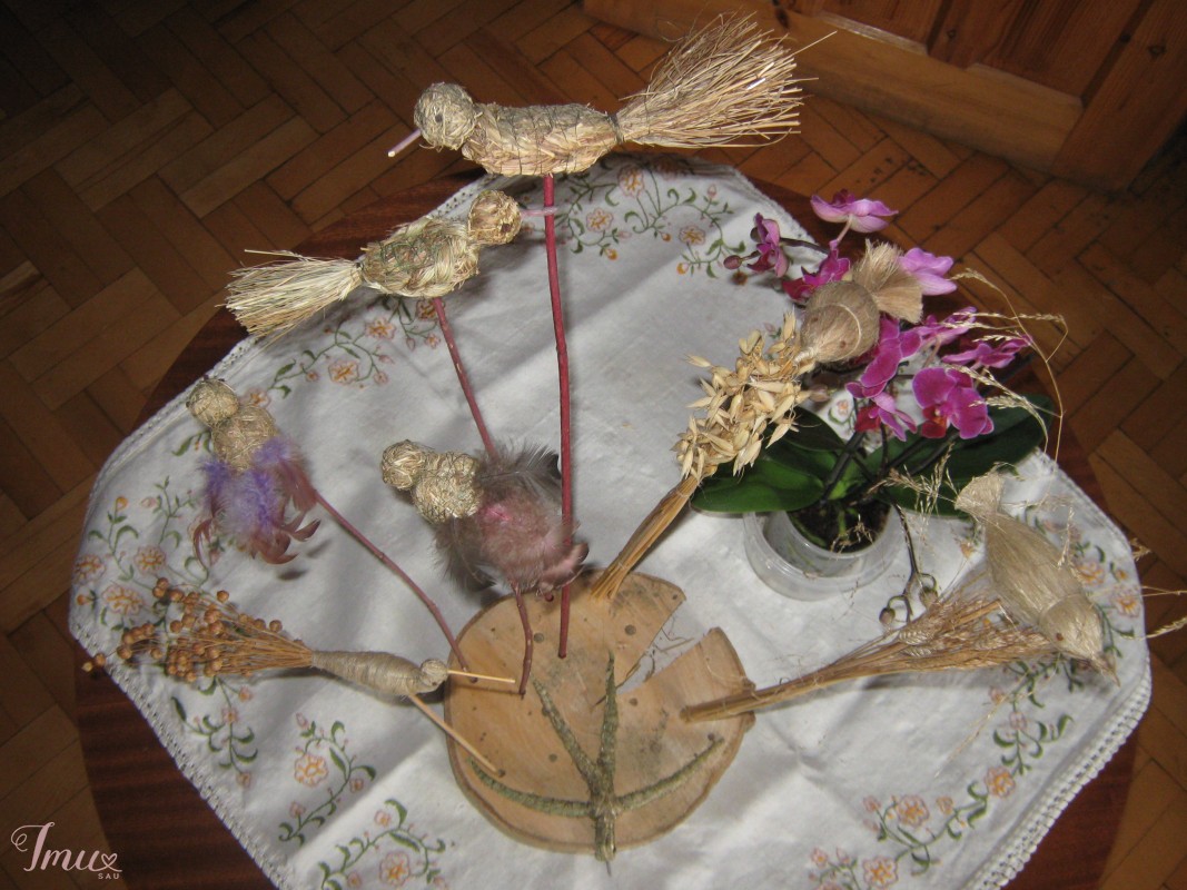 Kuriu paukščiukus iš žolės ir lino. Iš žolės vieneto kaina 1 euras, iš lino 1,5 euro, puokštelės iš varpų ir smilgų su paukščiuku 2 eurai, kompozicijos 5-8 eurai.