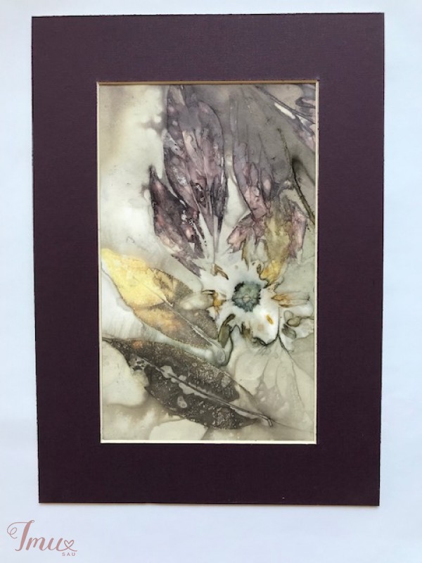 Paveiksliukas, sukurtas naudojant augalinės spauos techniką. Dydis su porėmiu 21 x 30 cm. Porėmis tamsiai violetinis. Augalinė spauda - tai aplinkai draugiška technika. Piešinys kuriamas nenaudojant jokių cheminių medžiagų ar sintetinių dažų. Spalvas ir piešinį kuria gamta. Daugiau mano darbų: https://www.facebook.com/Magicfeltdesigns/