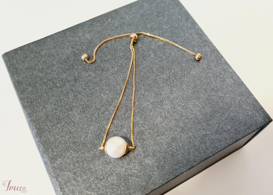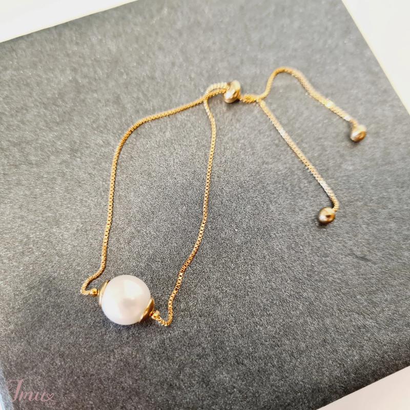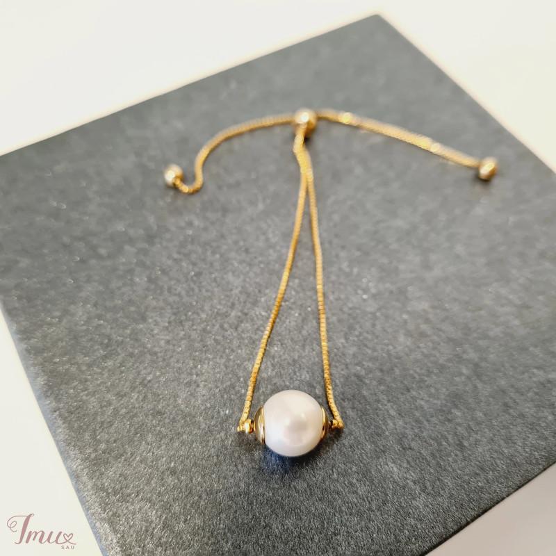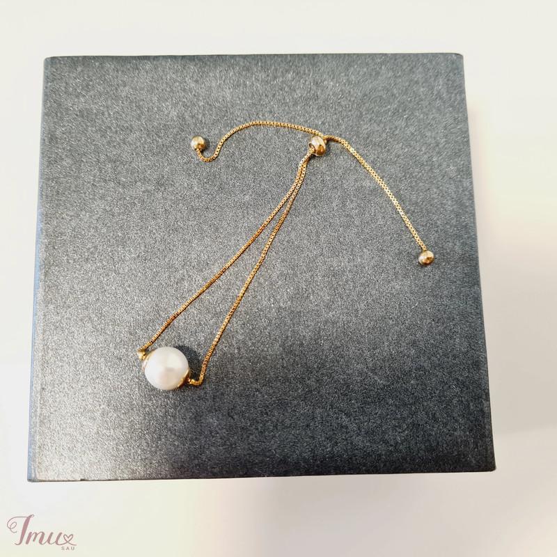 PEARLS OF LONDON apyrankė su perlu. Sudėtis: žalvaris dengtas rodžiu, organiškas perlas. Reguliuojamas ilgis. Galimas ilgis: 16 - 22 cm.