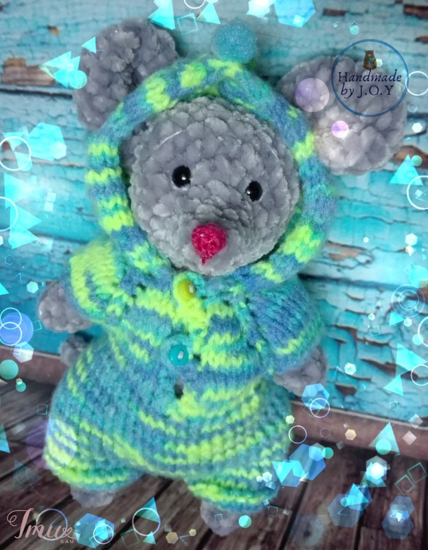 Visas letenėles galima pajudinti, sėdi, stovi. Kombinezonas nusiima. Aukštis 16cm. Verpalai: peliuko - pliušinis velvetas, kombinezino - bambukas. Užpildas: poliesteris.