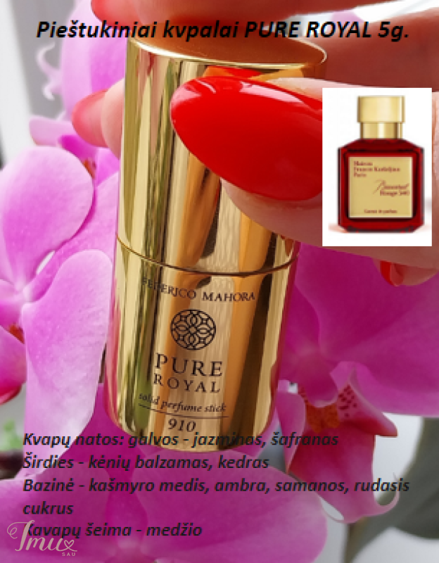Natomis yra panašus į BACCARAT ROUGE Charakteris: rafinuotas, perlaužtas saldumu Kvapų natos: Galvos: jazminas, šafranas Širdies: kėnių balzamas, kedras Bazinė: kašmyro medis, ambra, samanos, rudasis cukrus Kvapų šeima: MEDŽIO