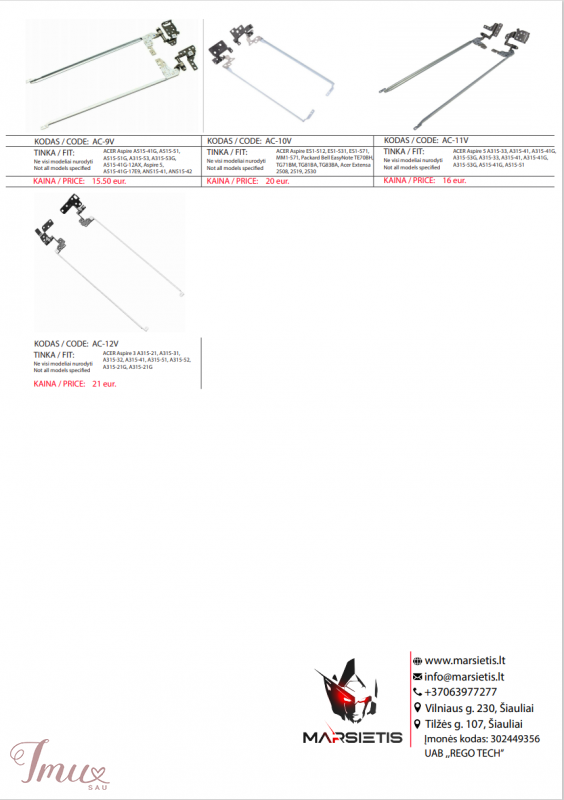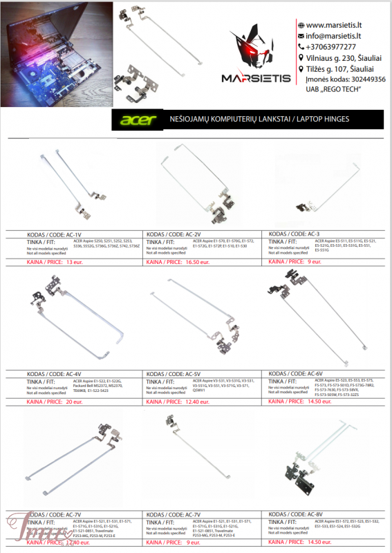 PIGIAUSIAI. ACER KOMPIUTERIO LANKSTAI, VYRIAI, EKRANO LAIKIKLIAI, ŠIAULIAI PIGIAUSIAI. ACER kompiuterio lankstai, vyriai, ekrano laikikliai Pristatymas visoje Lietuvoje per 1-2 d.d. (DPD kurjeriu, paštomatu, paštu, galima atsiimti vietoje). Suteikiama garantija 12 mėnesių. Visa konsultacija, remonto darbų užsakymas: +37063977277 / info@marsietis.lt / Vilniaus 230, Šiauliai Daugiau informacijos: www.marsietis.lt 1. ACER Aspire 5250, 5251, 5252, 5253, 5336, 5552G, 5736G, 5736Z, 5742, 5736Z, 5711, 5250-0810, 5733, 5720, 5733, 5253, 5741, AS5742-7620, 5733Z,5736, 5552, 5342, 33.BRG02.002, 33.M09N2.003, AM0HJ000300-R, AM0HJ000100-L, AMOHJ000100, AMOHJ000300AM0C9000600, AM0C9000500, 33.R4F02.004 lankstai. Kaina 13 eur. 2. ACER Aspire E1-570, E1-570G, E1-572, E1-572G, E1-572P, E1-510, E1-530, E1-530G, E1-532, E1-532G, Packard Bell V5WT2, e1 z5we1, TE69BM, TE69CX, TE69HW, TMP255-M, TMP255-MG, V5-561, V5-561G, E1-570-6417, E1-570-6612, E1-570-6803, AM0VR000300, AM0VR000200, 33.M8EN2.004, AM0VR00020C lankstai. Kaina 16.50 eur. 3. ACER Aspire E5-511, E5-511G, E5-521, E5-521G, E5-531, E5-531G, E5-551, E5-551G, 5-571, E5-571G, E5-572G, EK-571G, V3-532, V3-572, V3-572G, ACER Extensa 2509, 2510, 2510G, Acer TravelMate TMP256-M, TMP256-MG, Z5WAL, E1-531G, E1-521, E1-521G, E1-571G, 33.ML9N2.004, AM154000A00, AM154000B00 lankstai. Kaina 9 eur. 4. ACER Aspire E1-522, E1-522G, Packard Bell MS2372, MS2370, TE69KB, E1-522-5423 AM0VR000300, AM0VR000200, 34.4YU05.021, 34.4YU04 lankstai. Kaina 20 eur. 5. ACER Aspire V3-531, V3-531G, V3-531, V3-551G, V3-551, V3-571G, V3-571, Q5WV1, 33.M03N2.007, AM0N7000200, AM0N7000400, AMON7000200 lankstai. Kaina 12.40 eur. 6. ACER Aspire E5-523, E5-553, E5-575, F5-573, F5-573-501D, F5-573G-78R2, F5-573-7630, F5-573-58VX, F5-573-505W, F5-573-32ZS, E5-575-54E8, E5-575-79EP, E5-575-52JF, E5-575-51GG, E5-575G-53VG, E5-575G-527J, E5-575G, E5-553-T2XN, E5-553G, E5-573, E5-576, N16Q3, E5-523G FBZAA015010, FBZAA014010, 33.GDEN7.002, 60.GDZN7.001, 33.GDEN7.001 lankstai. Kaina 14.50 eur. 7. ACER Aspire E1-521, E1-531, E1-571, E1-571G, E1-531G, E1-521G, E1-521-0851, Travelmate P253-MG, P253-M, P253-E, P253, Gateway NV57H96U, NV57H77U, NV57H73U, NV57H58U, NV57H50U,V57H48U, NV57H43U, NV57H26U, NV57H22U, NV57H14U, NV57H13U, NV56R11U, NE56R31U, NV56R38U, NV56R23U, NV56R22U, NV56R21U, NV56R14U, NV56R12U, NV56R10U, NV56R06U, NV56R04U, NV56R, NV55S38U, NV55, NE56R, NV55S, NV57H, NV57,NE51B, NV56,Easynote TS13, TS44, TS11, TE11HC, TE11HR, TE11BZ, TE11HR, TE11-BZ, TE11-HC, 33.BRG02.002, 33.M09N2.003, AM0HJ000300-R, AM0HJ000100-L, AMOHJ000100, AMOHJ000300 lankstai. Kaina 12.40 eur. 8. ACER Aspire ES1-572, ES1-523, ES1-532, ES1-533, ES1-524, ES1-532G, Extensa 2540, Packard Bell EasyNote TE69AP, 33.GD0N2.004, AM1NX000200, AM1NX000100 lankstai. Kaina 14.50 eur. 9. ACER Aspire A515-41G, A515-51, A515-51G, A315-53, A315-53G, A515-41G-12AX, Aspire 5, A515-41G-17E9, AN515-41, AN515-42, AN515-51, AN515-53, AN515-51-55WL N17C1, Predator Helios 300 G3-571, G3-572, PH315-51, AN515-51-504A, AN515-51-5082, AN515-51-50PN, AN515-51-50SA, 300 G3-571-77QK, 33.GP4N2.004, 33.GP4N2.003, AM211000200, AM211000300 lankstai. Kaina 12.80 eur. 10. ACER Aspire ES1-512, ES1-531, ES1-571, MM1-571, Packard Bell EasyNote TE70BH, TG71BM, TG81BA, TG83BA, Acer Extensa 2508, 2519, 2530, Gateway NE512,ES1-512-C5WE 33.MRWN1.003, 433.03703.0011, 433.03704.0021 lankstai. Kaina 20 eur. 11. ACER Aspire 5 A315-33, A315-41, A315-41G, A315-53G, A315-33, A315-41, A315-41G, A315-53G, A515-41G, A515-51, A515-51G, A315-53, A515-51G-84SN (AD66), A515-51-58HD AM28Z000100, AM28Z000200, 33.GP4N2.004, 33.GP4N2.003 lankstai. Kaina 16 eur. 12. ACER Aspire 3 A315-21, A315-31, A315-32, A315-41, A315-51, A315-52, A315-21G, A315-21G 33.GNPN7.001, 33.GNPN7.002, FBZAJ005010, FBZAJ007010 lankstai. Kaina 21 eur. www.marsietis.lt / info@marsietis.lt / +37063977277 Vilniaus g. 230 Šiauliai / Tilžės g. 107, Šiauliai Taip pat siūlome įsigyti ir kitų gamintojų lankstų: ACER, APPLE, ASUS, DELL, FUJITSU, HP, LENOVO, MSI, PACKARD BELL, SONY, TOSHIBA Pas mus atliekamas visų kompiuterių, apple įrenginių, telefonų, planšečių, navigacijų, fotoaparatų, vaizdo kamerų, briedžių, paspirtukų, gamybos staklių elektronikos ir t.t. remontas.