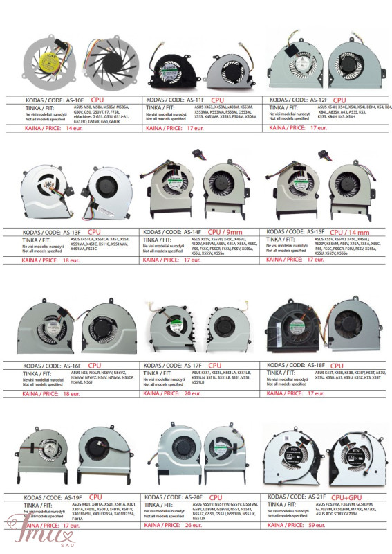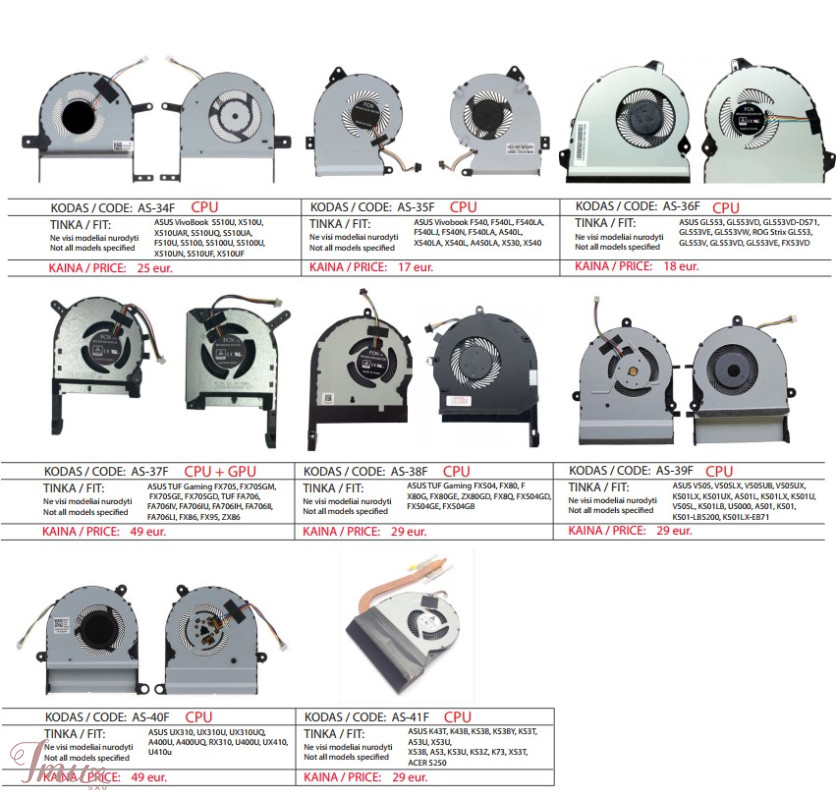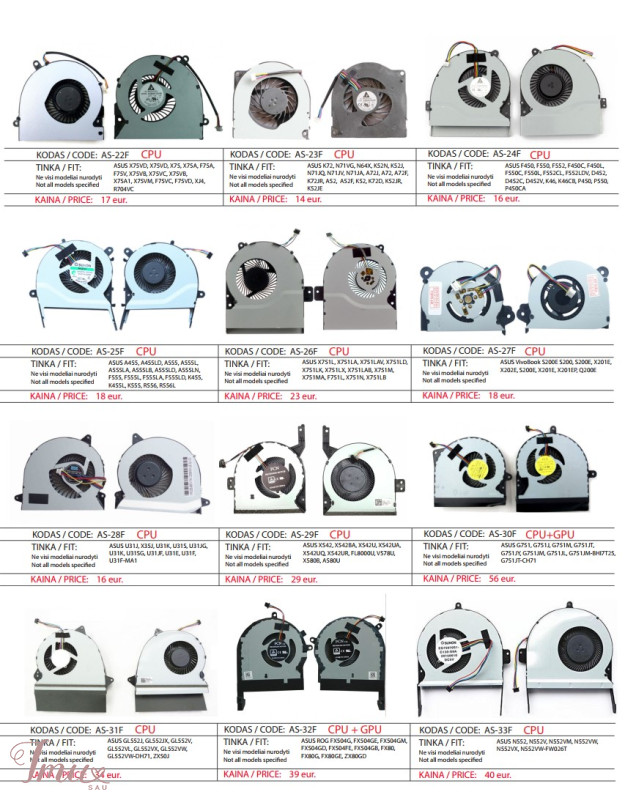 PIGIAUSIAI. ASUS kompiuterio aušintuvai, cooler, aušintuvas, ventiliatorius Pristatymas visoje Lietuvoje per 1-2 d.d. (DPD kurjeriu, paštomatu, paštu, galima atsiimti vietoje). Suteikiama garantija 12 mėnesių. Visa konsultacija, remonto darbų užsakymas: +37063977277 / info@marsietis.lt / Vilniaus 230, Šiauliai Daugiau informacijos: www.marsietis.lt 1. ASUS V505, V505LX, V505UB, V505UX, K501LX, K501UX, A501L, K501LX, K501U, V505L, K501LB, U5000, A501, K501, K501-LB5200, K501LX-EB71. Kaina 49 eur. 2. ASUS K40, K40E, K40AN, K40AC, K40AB, K40IN, K40IE, K40AF, F70, F90, F70SL, F90SV, K50, K51, K60, K70, K40ID, K40IJ, K50AB, K50AD, K50C, K50i, K50IA, K50IJ, K50IN, K51AC, K51AE, K60I, K60IJ, K70C, M70, N70, N90, P50, P50IJ, X5, X5D, X5DAF, X5DC, X5DI, X5DIJ, X5EA, K50AF, X8AAf, X8AI, K70IJ, P81IJ, A41 A41I, X70AB. Kaina 10.50 eur. 3. ASUS K42Jr, K42, K42, A42, X42J, A52, A52F, eMachines G73, G73J, N52D, N61, N61J, N61Jq, N61Jv, N61V, N61VG, N64, N64X, N71, N71JA, N71JQ, N71JV, N71VG, K52, K52F, K52DR, K52JB, K52JC, K52JE, K52JK, K52JR, K72, K72D, K72DR, X52, X52J, A40J, A40JP, A42, A42J, A42JR, A42JV, K42JC. Kaina 17 eur. 4. ASUS X556, X556U, X556UQ, A556U, K556U, X556UV, V556U, 4X556UB, X456U, FL5900U, V556U, R558U, X556UB, VM591U, FL5900L, X556UB, X556UV, R558UB-XO053T, R558UV, R558UR, R558UJ, R558UB, R558UA, R456, A456U, FL5900UQ, K556UJ, K456U. Kaina 16 eur. 5. ASUS K55, K55D, K55DR, X55DP, K55N, K55DE, A55D, K55VD, K55VM, K55VJ, U57A, K55N-DS81, K55DR-SH61. Kaina 15.40 eur. 6. ASUS N45SF, N45SL, N45SL, N45S, N55, N55S, N55SL, N55SF, N45SF-V2G, N45SF-V2G-VX013R, N45SF-V2G-VX041V, K55, N45VM. Kaina 18 eur. 7. ASUS S400, S400C, S400CA, S400E, X402C, X402E, X402C, X502C, X502C-RB01, X502CA, X502CA-B, X502CA-DB31, X502C-RB01, X502CA, X502CA-B, X502CA-DB31, S300C, F402C, X402CA, V500C, S500CA, F402, F402C, F502C. Kaina 18 eur. 8. ASUS N550, N550J, N550JV, N550JK, N550L, N750, N750JK, N750JV, N550LF, N550JA, G550J, N550JK-CM305H, G550JK, Q550LF, N550X42JV . Kaina 18 eur. 9. ASUS X409U, Y5200D, Y4200D, X509F, X509U, X409F, FL8700D, M509D, X409U, X509U, X409F, X509F, FL8700D, FL8700. Kaina 19 eur. 10. ASUS M50, M50V, M50SV, M50SA, G50V, G50, G50VT, F7, F7SR, eMachines G G51, G51J, G51J-A1, G51J3D, G51VX, G60, G60JX, G60VX, M50, M50V, M50VC, G50S, M50VM, M50VN, M50S, M50SA, M50SR, M50SV, M50Q, M51, M51KR, M51SE, M51SN, M51SR, M51VA, M51VR, N50, N50V, N50J, X55, X55S, X55SA, X55SR, X55SV, X57, X57S, X57V, X57SA, X57SR, X57SV, X57VC, X57VM, X57VNQ, Pro58VC, Pro58SA, Pro58VM, Pro5AV. Kaina 14 eur. 11. ASUS X453, X453M, x403M, X553M, X553MA, K553MA, F553M, D553M, X553, X453MA, X553S, F503M, X503M. Kaina 11 eur. 12. ASUS X54H, X54C, X54L X54L-BBK4, X54, X84, X84L, A83SV, A43, A53S, K53, K53S, X84H, K43, X54H, K54HR, X54HR, K43LY, X44H, X84HR, K43LY, K54LY, X54HR, K54, K54C, K54H, K54HR, K54L K84 K84. Kaina 17 eur. 13. ASUS X451CA, X551CA, X451, X551, X551MA, X451C, X511C, X551MAV, X451MA, F551C. Kaina 18 eur. 14. ASUS X55V, X55VD, X45C, X45VD, R500V, K55VM, A55V, X45A, X55A, X55C, F55, F55C, F55CR, F55U, F55V, X55Sa, X55U, X55SV, X55Sa. Kaina 17 eur. 15. ASUS X55V, X55VD, X45C, X45VD, R500V, K55VM, A55V, X45A, X55A, X55C, F55, F55C, F55CR, F55U, F55V, X55Sa, X55U, X55SV, X55Sa. Kaina 17 eur. 16. ASUS N56, N56JR, N56VV, N56VZ, N56VW, N76VZ, N56V, N76VM, N56DP, N56VB, N56J, N56JK, N56SL, N56VM, N56DY, N76VB, N76VJ, N56X. Kaina 18 eur. 17. ASUS K551, K551L, K551LA, K551LB, K551LN, S551L, S551LB, S551, V551, V551LB, R553L, A551LB-XX134H, K551LB-XX183H, K551LB-XX183H, K551LB-XX183. Kaina 20 eur. 18. ASUS K43T, K43B, K53B, K53BY, K53T, A53U, X53U, X53B, A53, K53U, K53Z, K73, X53T, ACER 5250, 5251, 5253, 5333, 5336, 5551, 5551G, 5552, 5552G, 5733, 5736, 5736G, 5736Z, 5741, 5742, eMachines E442, E443, E529, E640, E729. Kaina 17 eur. 19. ASUS X401, X401A, X501, X501A, X301, X301A, X401U, X501U, X401V, X501V, X401EE45U, X401EI235A, X401EI235A, F401A . Kaina 17 eur. 20. ASUS N551V, N551VW, G551V, G551VM, G58V, G58VM, G58VW, N551, N551J, N551Z, G551, G551J, N551JW, N551JK, N551JX, N551JK, N551JX, N551VM, N751JK. Kaina 26 eur. 21. ASUS FZ63VM, FX63VM, GL503VM, GL703VM, FX503VM, M7700, M7300, ASUS ROG STRIX GL703V. Kaina 59 eur. 22. ASUS X75VD, X75VD, X75, X75A, F75A, F75V, X75VB, X75VC, X75VB, X75A1, X75VM, F75VC, F75VD, XJ4, R704VC. Kaina 17 eur. 23. ASUS K72, N71VG, N64X, K52N, K52J, N71JQ, N71JV, N71JA, A72J, A72, A72F, K72JR, A52, A52F, K52, K72D, K52JR, K52JE, K52F, K52JC, K52JB, K52JK, K72DR, K52DR, K72, N61J, N64, N71JA, N71VG, N61JV, N64X, N71JQ, N61, N61V, N71, N71JV, N61VG, N61JQ. Kaina 14 eur. 24. ASUS F450, F550, F552, F450C, F450L, F550C, F550L, F552CL, F552LDV, D452, D452C, D452V, K46, K46CB, P450, P550, P450CA, P550CA, P550LA, R510, R513, R510C, R510CC, R510L, R510LAV, R510LD, R510LDV, R510LN, R513CL, S56, S550, S550CM, X450, X452, X550, X450EP, X450CA, X450VP, X450C, X450CP, X452EP, X452EA, X452E, X550V, X550C, X550CA, X550CC, X550CL, X550LA, X550LC, X550VC, X550DP,Y581, Y581C, Y581CC, Y581JD, Y581LB k550J W50JK A550J X550J F550JK R510JK FX50J, A550V. Kaina 16 eur. 25. ASUS A455, A455LD, A555, A555L, A555LA, A555LB, A555LD, A555LN, F555, F555L, F555LA, F555LD, K455, K455L, K555, R556, R556L, R556LA, R556LB, R556LD, R557, R557L, W419L, W519L, X455, X455CC, X455LD, X554, X554L, X554LA, X554LD, X554LI, X554LJ, X554LN, X554LP, X555, X555LA, X555LD, X555LJ, X555LN, X555LP, X555LB, X555LF, X555LI, X555UA, X555u . Kaina 18 eur. 26. ASUS X751L, X751LA, X751LAV, X751LD, X751LK, X751LX, X751LAB, X751M, X751MA, F751L, X751N, X751LB, K751LJ-TY414T, K751Y-TY125T, K751LJ-TY416T. Kaina 23 eur. 27. ASUS VivoBook S200E S200, S200E, X201E, X202E, S200E, X201E, X201EP, Q200E, X201EV, 200CA, X200, X200AM, F200C, F200CA, X200C, X200L, X200M. Kaina 18 eur. 28. ASUS U31J, X35J, U31K, U31S, U31JG, U31K, U31SG, U31JF, U31E, U31F, U31F-MA1, U31F-MD1 . Kaina 18 eur. 29. ASUS X542, X542BA, X542U, X542UA, X542UQ, X542UR, FL8000U, V578U, X580B, A580U, F580U, A580B, X542UQ-DM137, X542UQ-DM106, FAN37. Kaina 29 eur. 30. ASUS