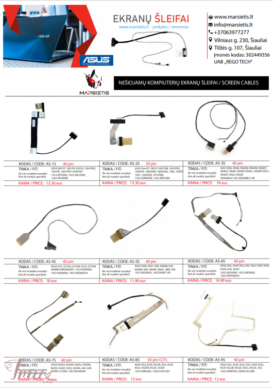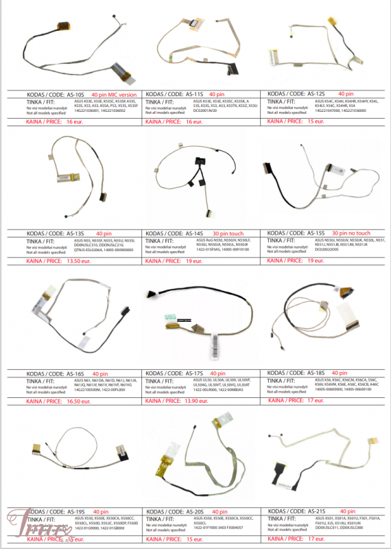 PIGIAUSIAI. ASUS nešiojamų kompiuterių ekranų šleifai, ŠIAULIAI PIGIAUSIAI. ASUS kompiuterio ekrano šleifai. Pristatymas visoje Lietuvoje per 1-2 d.d. (DPD kurjeriu, paštomatu, paštu, galima atsiimti vietoje). Suteikiama garantija 12 mėnesių. Visa konsultacija, remonto darbų užsakymas: +37063977277 / info@marsietis.lt / Vilniaus 230, Šiauliai Daugiau informacijos: www.marsietis.lt 1. (AS-1S) ASUS EEE PC 1001PX, R101D, 1422-00U0000 40 pin. Kaina 13.30 eur. 2. (AS-2S) ASUS Eee PC 1001P, 1001PXB, 1422-00MK000 30 pin. Kaina 13.30 eur. 3. (AS-3S) ASUS N56, N56V, N56VB, DDNJ8GLC100 40 pin. Kaina 18 eur. 4. (AS-4S) ASUS G73, G73JH, G73JW, G73J, 1422-00TA000 40 pin. Kaina 18 eur. 5. (AS-5S) ASUS K50I, K501, K40, K40AB, 1422-00G90AS 40 pin. Kaina 11.90 eur. 6. (AS-6S) ASUS A42, A42F, K42, X42 1422-00SU000 40 pin. Kaina 16.90 eur 7. (AS-7S) ASUS K43SA, K43SD, K43SJ, DD0KJ2LC100 40 pin. Kaina 16 eur. 8. (AS-8S) ASUS K52, K52F, 1422-00RL000 CCFL 30 pin. Kaina 13 eur. 9. (AS-9S) ASUS A52, A52F, 1422-00NP0AS 40 PIN. Kaina 13 eur. 10. (AS-10S) ASUS K53E, X53E, K53SC, K53SK, 14G221036001 MIC versijon. Kaina 16 eur. 11. (AS-11S) ASUS K53E, X53E, K53SC, K53SK, DC02001AV20 NO MIC. Kaina 16 eur. 12. (AS-12S) ASUS K54C, K54H, 14G221047000 40 PIN. Kaina 15 eur. 13. (AS-13S) ASUS N55, N55SF, N55S, N55U, DD0NJ5LC310 40 PIN. Kaina 13.50 eur. 14. (AS-14S) ASUS ROG Q550, Q550LF, N550JV, 1422-01SF0AS 30 PIN TOUCH. Kaina 19 eur. 15. (AS-15S) ASUS N551, N551J, N551JX, N551JW, N551JQ DC020022O0S 30 PIN NON-TOUCH. Kaina 19 eur. 16. (AS-16S) ASUS N61, N61DA, N61D, 1422-00PL000 40 PIN. Kaina 16.50 eur. 17. (AS-17S) ASUS UL50, UL50A, UL50V, 1422-00LR000 40 PIN. Kaina 13.90 eur. 18. (AS-18S) ASUS K56, K56C, K56CM, 14005-00600000 40 PIN. Kaina 17 eur. 19. (AS-19S) ASUS X550, X550E, X550CA, 1422-01G9000 40 PIN. Kaina 15 eur. 20. (AS-20S) ASUS X550, X550E, X550CA, 1422-01FY000 40 PIN. Kaina 15 eur. 21. (AS-21S) ASUS X501, X501A, X501U, DD0XJ5LC011 40 PIN. Kaina 17 eur. 22. (AS-22S) ASUS X50R, X50RL, X50N, 14G100313802 30 PIN. Kaina 17 eur. 23. (AS-23S) ASUS K55DE, K55V, U57A, 14005-00620000 40 PIN. Kaina 18 eur. 24. (AS-24S) ASUS X551C, F551C, X551M, 14005-01070400 40 PIN. Kaina 16 eur. 25. (AS-25S) ASUS N53, N53S, N53JG, 1422-00RV000 40 PIN. Kaina 15.50 eur. 26. (AS-26S) ASUS X553, X553MA, 1422-01VY0AS 40 PIN. Kaina 19 eur. 27. (AS-27S) ASUS X553, X553MA, X553M, 1422-02550AS 30 PIN. Kaina 19 eur. 28. (AS-28S) ASUS X502CA, X502, X502C, 1422-01CU000 40 PIN. Kaina 18 eur. 29. (AS-29S) ASUS X555L, K555, A555, 1422-01UQ0AS 40 PIN. Kaina 18 eur. 30. (AS-30S) ASUS U31, U31SD, U31JG, 1422-00YJ000 40 PIN. Kaina 19 eur. 31. (AS-31S) ASUS G71V, GG72GX, G71GX, 1422-001L000 30 PIN. Kaina 23 eur. 32. (AS-32S) ASUS Vivobook K551, K551L, DDXJ9BLC010 30 PIN. Kaina 18 eur. 33. (AS-33S) ASUS X453, X403M, X453MA, DD0XK1LC000 40 PIN. Kaina 18 eur. 34. (AS-34S) ASUS S300CA, R300CA, DD0XJ7LC000 40 PIN. Kaina 24 eur. 35. (AS-35S) ASUS G501JW, G501VW, DD0BK5LC011 30 PIN. Kaina 29 eur. 36. (AS-36S) ASUS G501JW, G501VW, DDBK5ALC111 UHD 40 PIN. Kaina 29 eur. 37. (AS-37S) ASUS X540SA, X540S, X540, DDXKAKLC020 30 PIN. Kaina 19 eur. 38. (AS-38S) ASUS E502S, E502M, E502MA 1422-022F0AS 30 PIN. Kaina 19 eur. 39. (AS-39S) ASUS S550CA, S550CB, 1422-01CR000 40 PIN. Kaina 25 eur. 40. (AS-40S) ASUS ROG G771J, N751, 14005-01470200 30 pin. Kaina 29 eur. 41. (AS-41S) ASUS A73E, K73E, X73E, 1422-00X5000 40 PIN. Kaina 23 eur. 42. (AS-42S) ASUS X556U, X556UJ, 1422-02590AS 30 PIN. Kaina 26 eur. 43. (AS-43S) ASUS ROG G752, G752V, 1422-02G10AS 30 PIN NO TOUCH. Kaina 26 eur. 44. (AS-44S) ASUS ROG G752, G752V, 1422-02770AS 30 PIN WEBCAM version. Kaina 26 eur. 45. (AS-45S) ASUS UX430, UX430UA, 14005-02210100 30 PIN. Kaina 30 eur. 46. (AS-46S) ASUS ZenBook UX305, UX305C, DC02C009Z0S 30 PIN. Kaina 30 eur. 47. (AS-47S) ASUS GL502VT, GL502VS, 1422-02B60AS 40 pin. Kaina 35 eur. 48. (AS-48S) AUS FX504GD, FX504GE, 14005-02660100 30 PIN. Kaina 35 eur. 49. (AS-49S) ASUS X751, X751ld, X751l, 14005-01190000 40 PIN. Kaina 35 eur. 50. (AS-50S) ASUS VivoBook Q301, Q301L, DD0EXALC000 40 PIN. Kaina 29 eur. 51. (AS-51S) ASUS VivoBook 15 X512D, X512U, X512UF, 1422-03B20AS 30 PIN. Kaina 35 eur. 52. (AS-52S) ASUS VivoBook 15 X512D, X512U, X512UF, 14005-02890700 30 PIN. Kaina 35 eur. www.marsietis.lt / info@marsietis.lt / +37063977277 Vilniaus g. 230 Šiauliai / Tilžės g. 107, Šiauliai Taip pat siūlome įsigyti ir kitų gamintojų šleifų: ACER, APPLE, ASUS, DELL, FUJITSU, HP, LENOVO, MSI, PACKARD BELL, SONY, TOSHIBA Pas mus atliekamas visų kompiuterių, apple įrenginių, telefonų, planšečių, navigacijų, fotoaparatų, vaizdo kamerų, briedžių, paspirtukų, gamybos staklių elektronikos ir t.t. remontas.