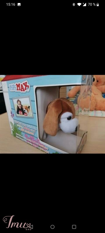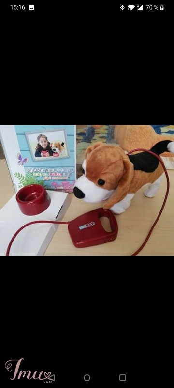 Vaikšto, yra pavadėlis, dubenėlis. Iškiša liežuvį, pakelia koją atliekant reikalus. Nėra traukimo. Amžius 3+