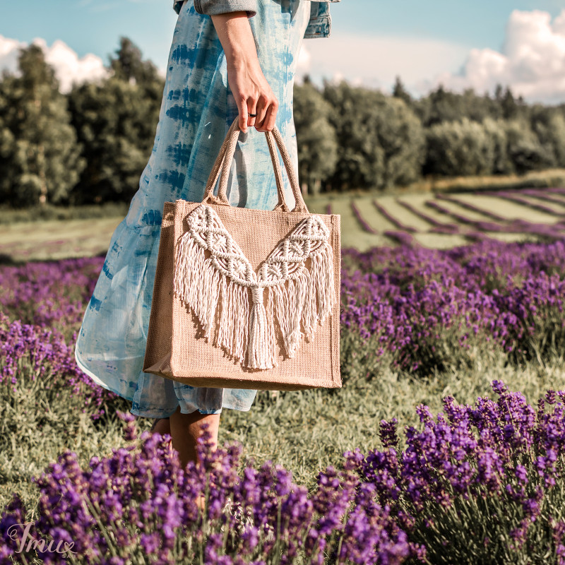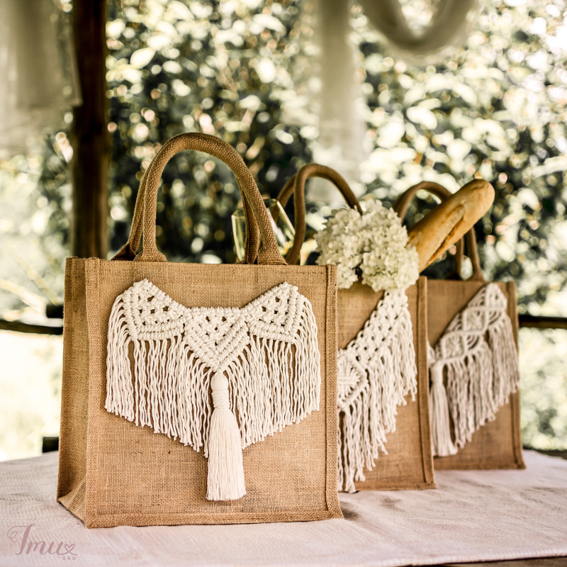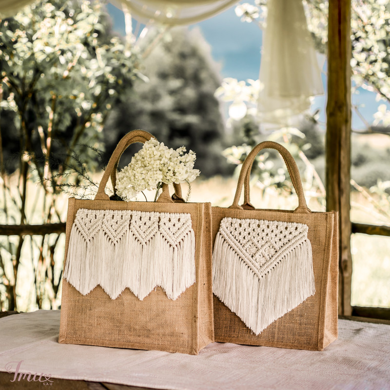 Maišeliai puošti macrame dekoru. Puikiai tinka piknikui, elegantiškam apsipirkimui ar namų interjerui puošti. Turiu 4 vnt. Maišelis iš džiuto medžiagos, vidus laminuotas, kad nešlaptų, macrame dekoras iš medvilninės virvės. Dydis: 30x30 cm; plotis ~18cm.