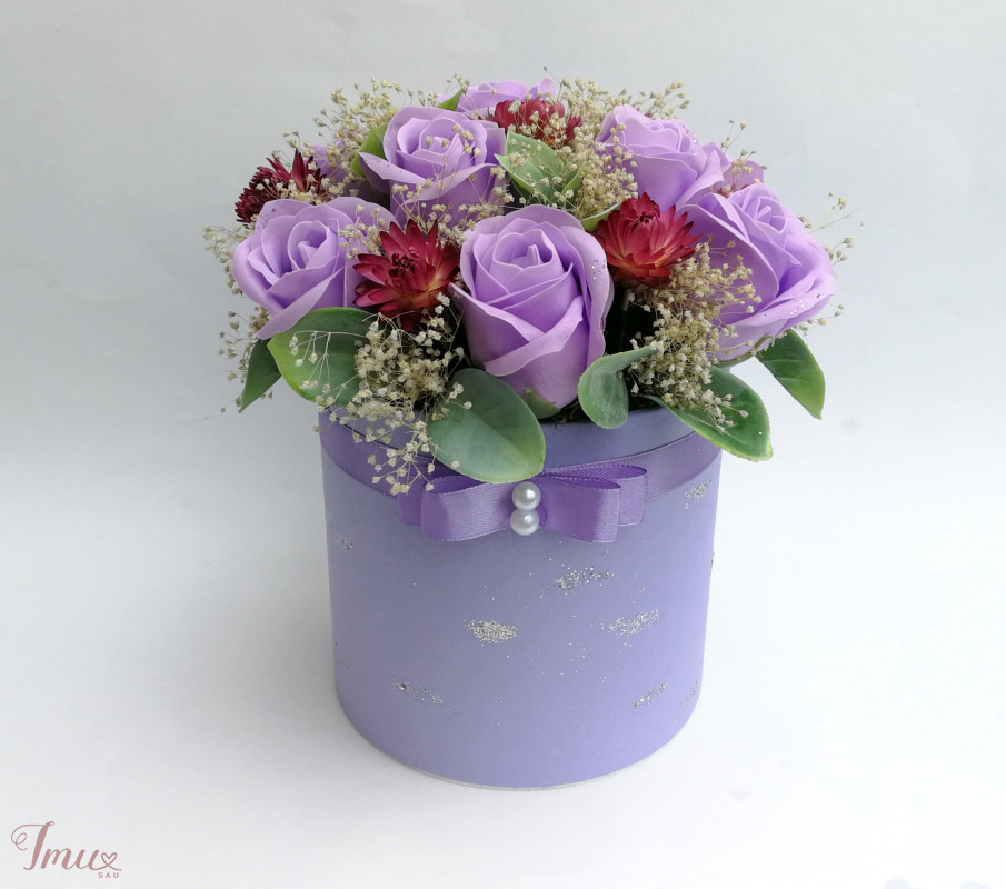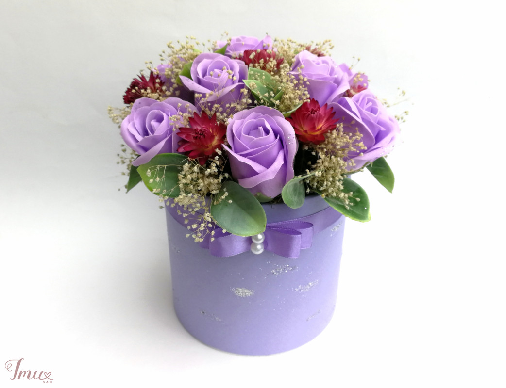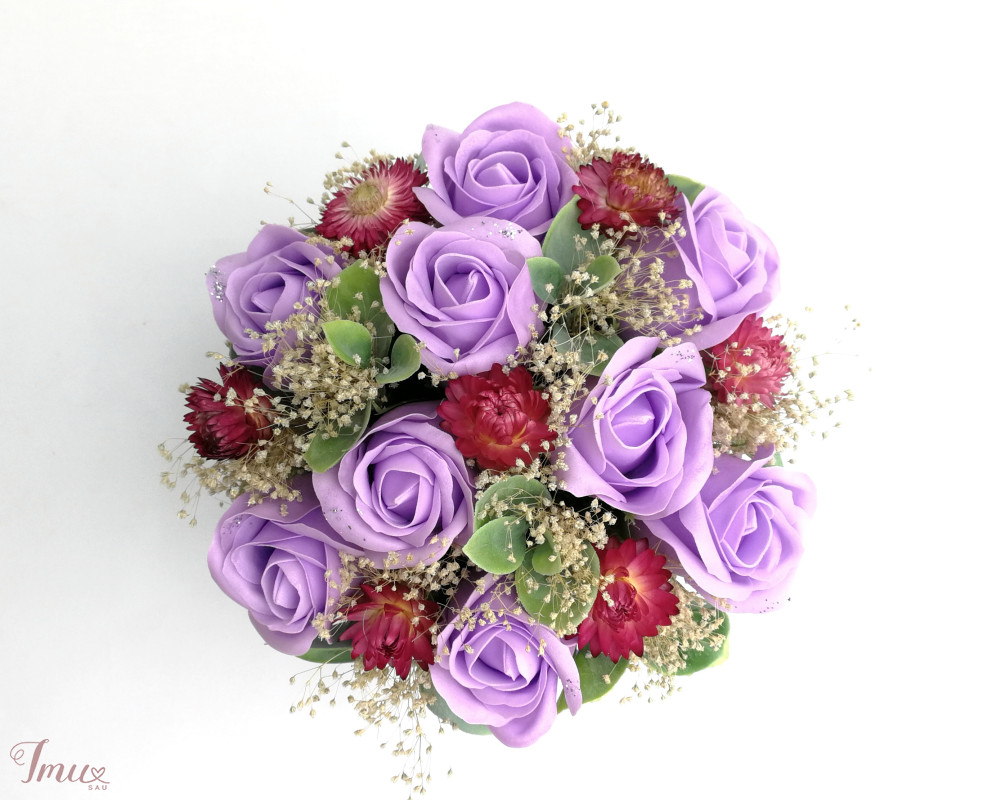 9 šviesiai violetinės muilo rožės, sausuoliai, dirbtinės detalės. Aukštis nuo stalo apie 21 cm, žiedyno skersmuo apie 21 cm.