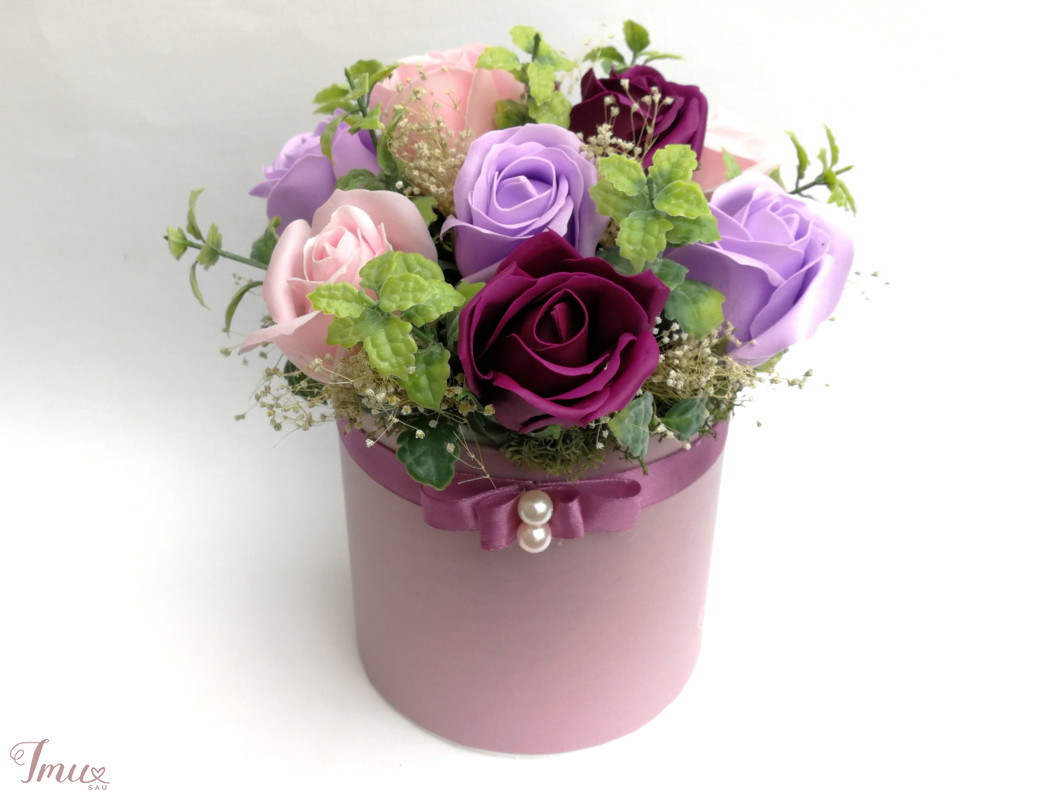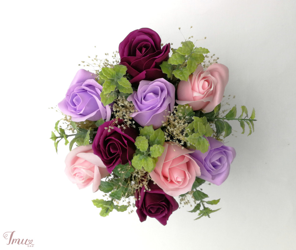 Devynios trijų spalvų plono muilo rožės, sausuoliai, dirbtinės detalės. Aukštis nuo stalo apie 21 cm, žiedyno skersmuo apie 20 cm. Kaina 16 eur