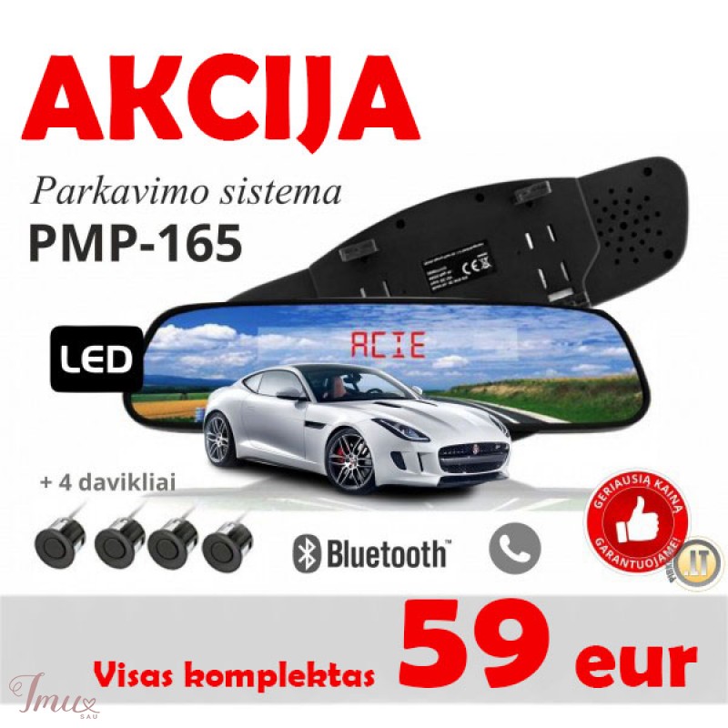 PMP-165 PARKAVIMO sistema VEIDRODYJE SU Bluetooth ir davikliais AKCIJA! KAINA DABAR TIK 59 EUR. Kiekis ribotas. PARKAVIMO SISTEMA SU 4 DAVIKLIAIS + VEIDRODIS + BLUETOOTH LAISVŲJŲ RANKŲ ĮRANGA Daugiau apie prekę: http://pirkciau.lt/parkavimo-sistemos/68-pmp-165-parkavimo-sistema.html PRISTATYMAS VISOJE LIETUVOJE PER 1-2 D.D. KAINA 59 eur. Tai daiktas, turintis kokybę! Garantija 12/24 mėnesiai. EKRANAS: Bevielis veidrodis, LED ekranas JUTIKLIAI: Juodi/sidabriniai/Kitos spalvos JUTIKLIŲ SKAIČIUS: 4 vnt. į galą JUTIKLIŲ SKERSMUO: 22 mm JUTIKLIŲ LAIDAS: 2.5 metrai JUTIKLIŲ ATSTUMAS: 0.3-2.0 metrų APRAŠYMAS: NAUJOS KARTOS DAUGIAFUNKCINIS VEIDRODIS SKIRTAS SAUGIAM, MALONIAM VAIRAVIMUI. Veidrodyje ne tik matysite informaciją, skirtą kliūčiai perspėti, bet ir atsiliepsite į skambučius be telefono. Jutikliai perspėja signalu apie artėjančią kliūtį, esančią automobilio gale. Veidrodyje matysite atstumą iki kliūties ir automobilio pusę, kuri artėja prie kliūties. Labai lengvas prietaiso instaliavimas. Veidrodis tvirtinamas ant originalaus veidrodžio. Prietaise yra slankikliai, kuriais lengvai uždėsite ant įvairių dydžių veidrodžių. Sistema pradeda veikti užvedus automobilį. JUTIKLIAI: Šalčiui bei vandeniui atsparūs jutikliai. 4 vienetai skirti automobilio galui. Spalva - juoda/sidabrinė/kitos spalvos. Spalva pasirenkama formuojant užsakymą. VEIDRODIS: LED ekranas. Rodomas atstumas iki kliūties metrais. Rodoma automobilio pusė. kuri artėja prie kliūties. Kai važiuojama priekine eiga, veidrodis atlieka įprastą veidrodžio funkciją. BLUETOOTH: Veidrodyje rodomas skambintojo ID arba telefono numeris. Galimybė atsiliepti, atmesti skambutį. Galimybė surinkti paskutinį skambinusį numerį. Veidrodyje įmontuotas auštos technologijos mikrofonas, kuris apsaugotas nuo pašalinio triukšmo.Galimybė keisti skambučio melodiją. Prietaise įdiegta 16 skirtingų melodijų. Galimybė pasijungti išorinius MP3, CD bei kitus grotuvus. FM siųstuvo pagalba garsas gali būti perduodamas per automobilio stereo sistemą. GARSINIS PERSPĖJIMAS: Pavojaus perspėjimas Bi-Bi-Bi signalas keturių skirtingų ilgių signalas. Kuo arčiau kliūties, tuo vientisesnis garsas PRIEDAI: DC 9~15V maitinimas, ausinės, audio kabelis, valdymo blokas, 4 davikliai, grąžtas, maitinimo laidas, zumeris, naudojimosi instrukcija (lietuvių k.), dėžutė. Sistema pilnai sukomplektuota, kad niekuo nereikėtų rūpintis. PAPILDOMA: PRIETAISAS NAUJAS, IŠTESTUOTAS, KOKYBĖ GARANTUOTA GARANTIJA:12/24 mėn. Prekę galima pristatyti per 1-2 darbo dienas į visus Lietuvos miestus ir miestelius. KONTAKTAI: +370 639 77277, info@pirkciau.lt, www.pirkciau.lt Atvykite pas mus: Vilniaus 230 arba Tilžės 107, Šiauliai Darbo laikas: I–V: 9,18 val., VI: 9,14 val.