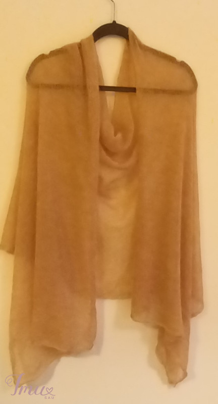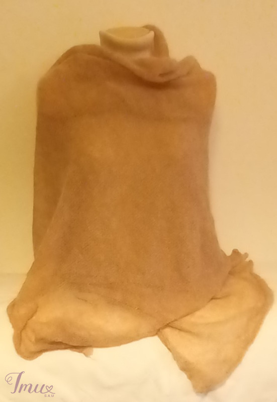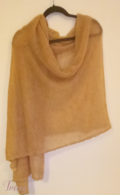 Dydis: plotis ~ 70 cm, ilgis iki 2 m. Sudėtis: 35 proc. - moheris, 35 proc. - alpaka, 30 proc. - poliamidas