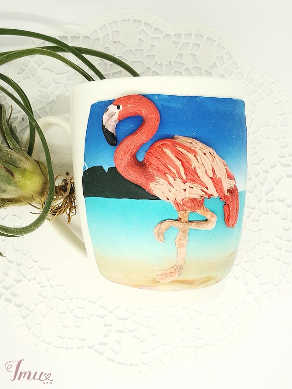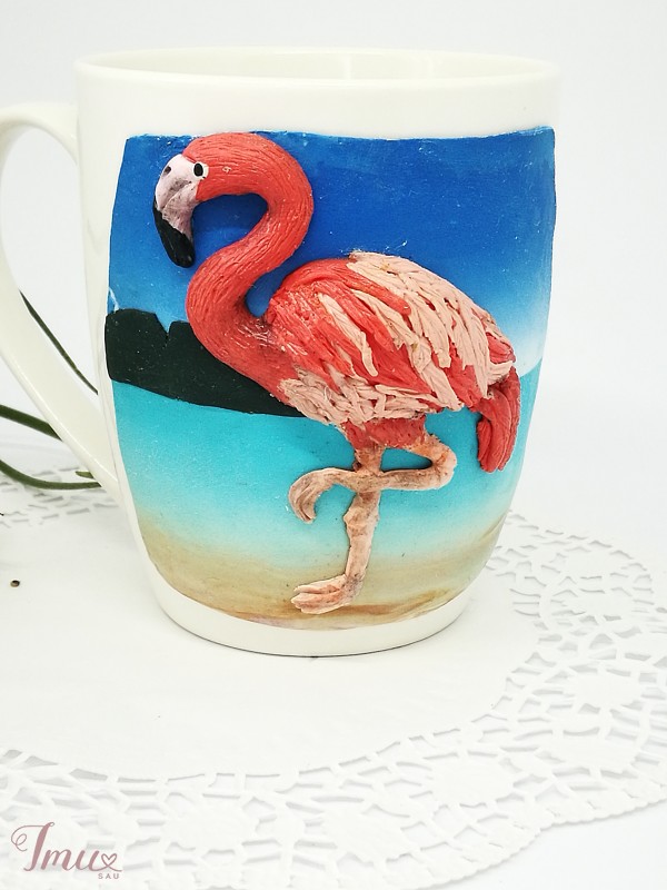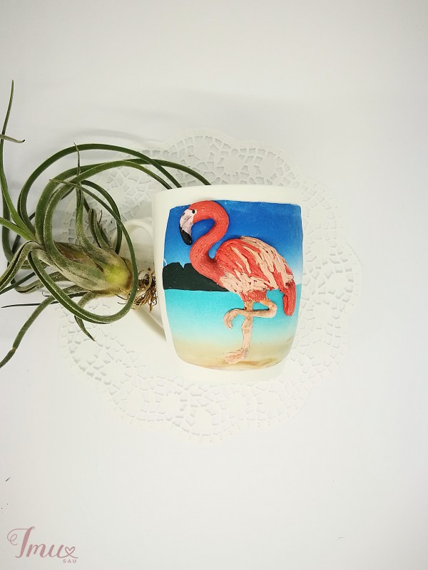 dekoruotas puodelis su flamingu, dekoras iš polimerinio molio