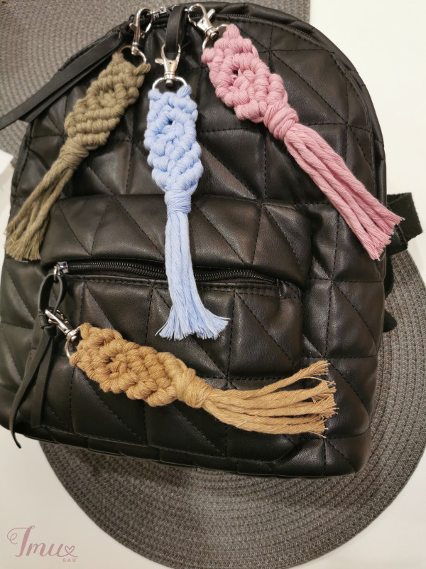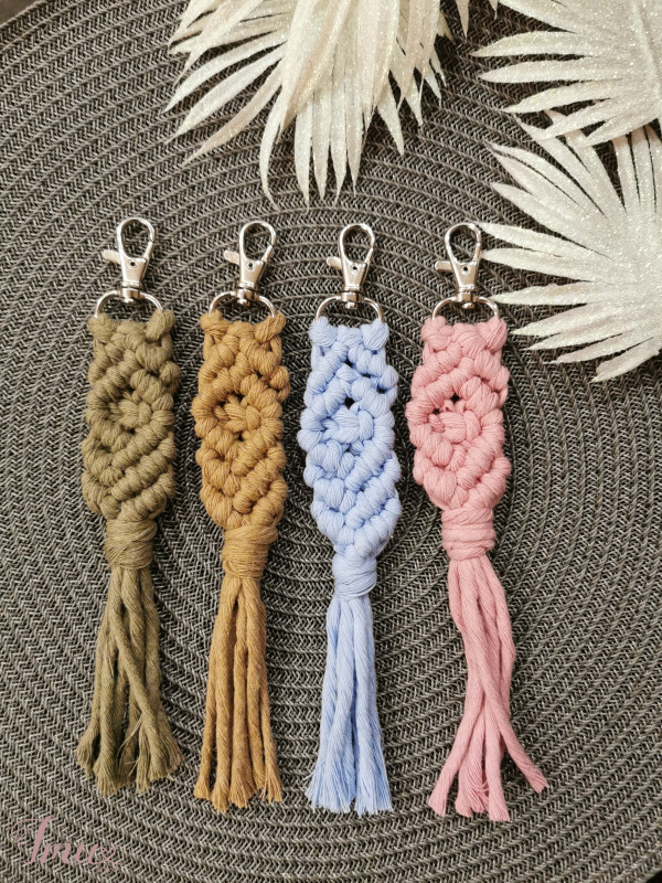 Unikalūs, rankų darbo, macrame raktų pakabukai. Puiki dovana sau, draugei. Pakabukus galime segti ne tik prie raktų, bet ir papuošti rankinę ar kuprinę. ❤️ Užsegimas sidabrinės spalvos. ❤️ 100% natūrali medvilnė. ❤️ Spalvos: chaki, tamsi smėlio, šviesiai rožinė, pastelinė melsva.
