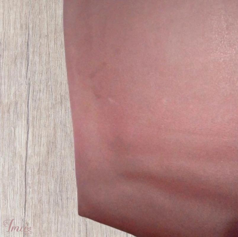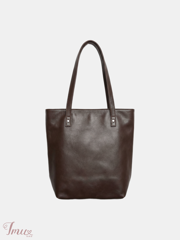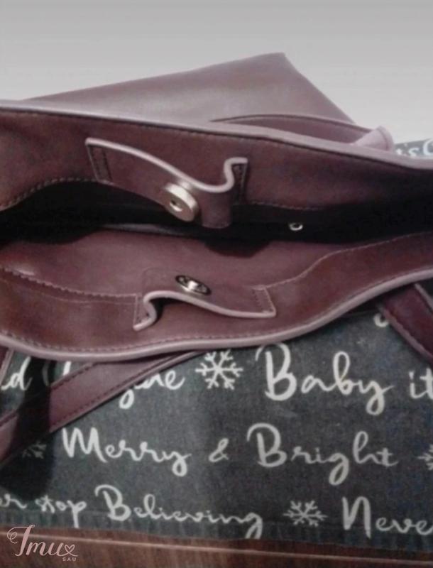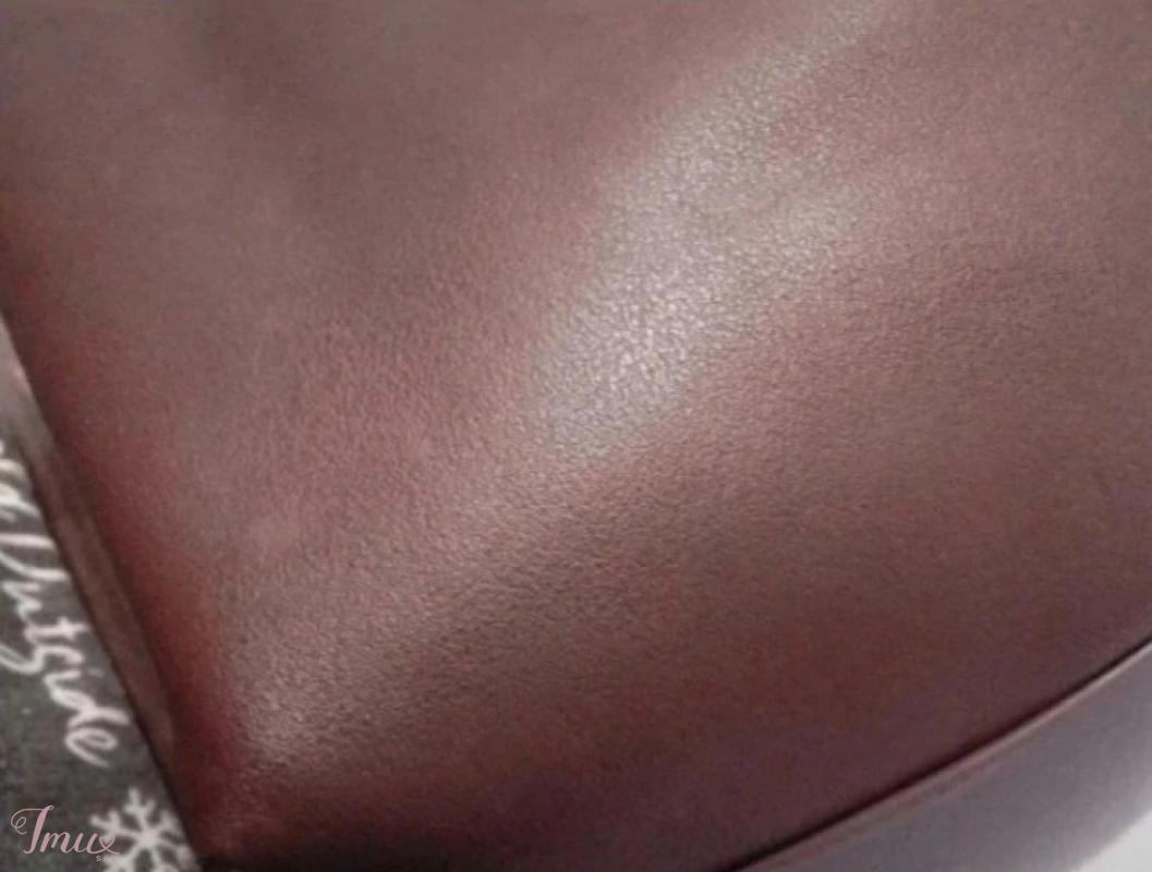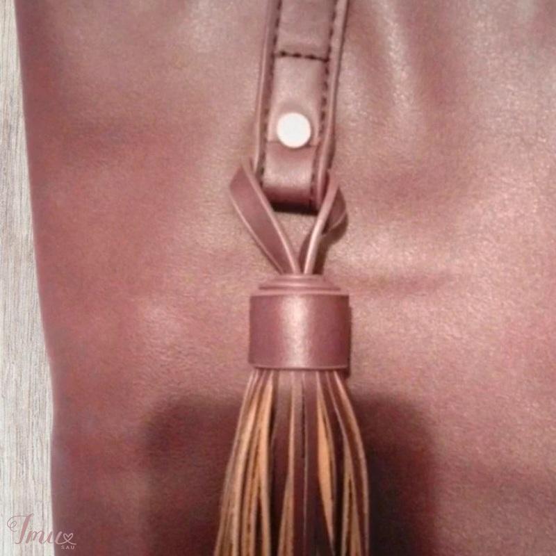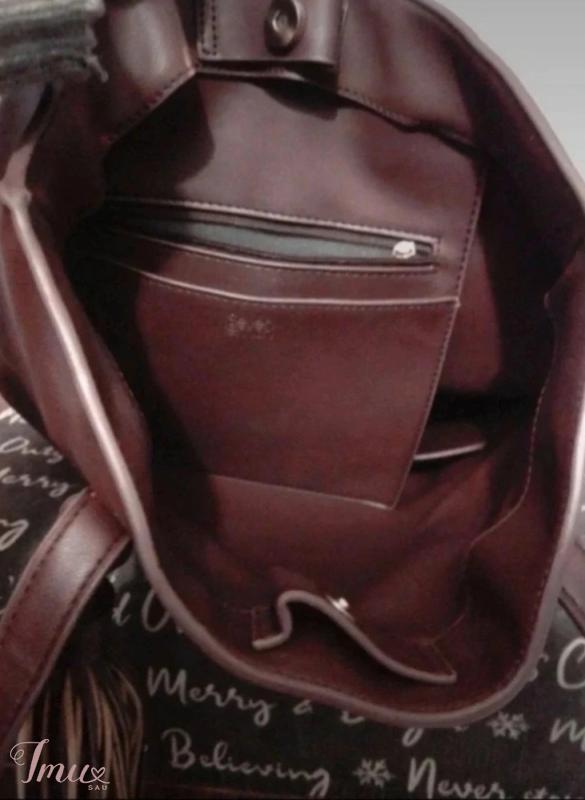 Ruda talpi rankinė su kutais. Pagrindinis skyrius užsisega su knopke, mažas skyrelis užsisega su užtrauktuku. Turi kelias balsvas dėmeles.