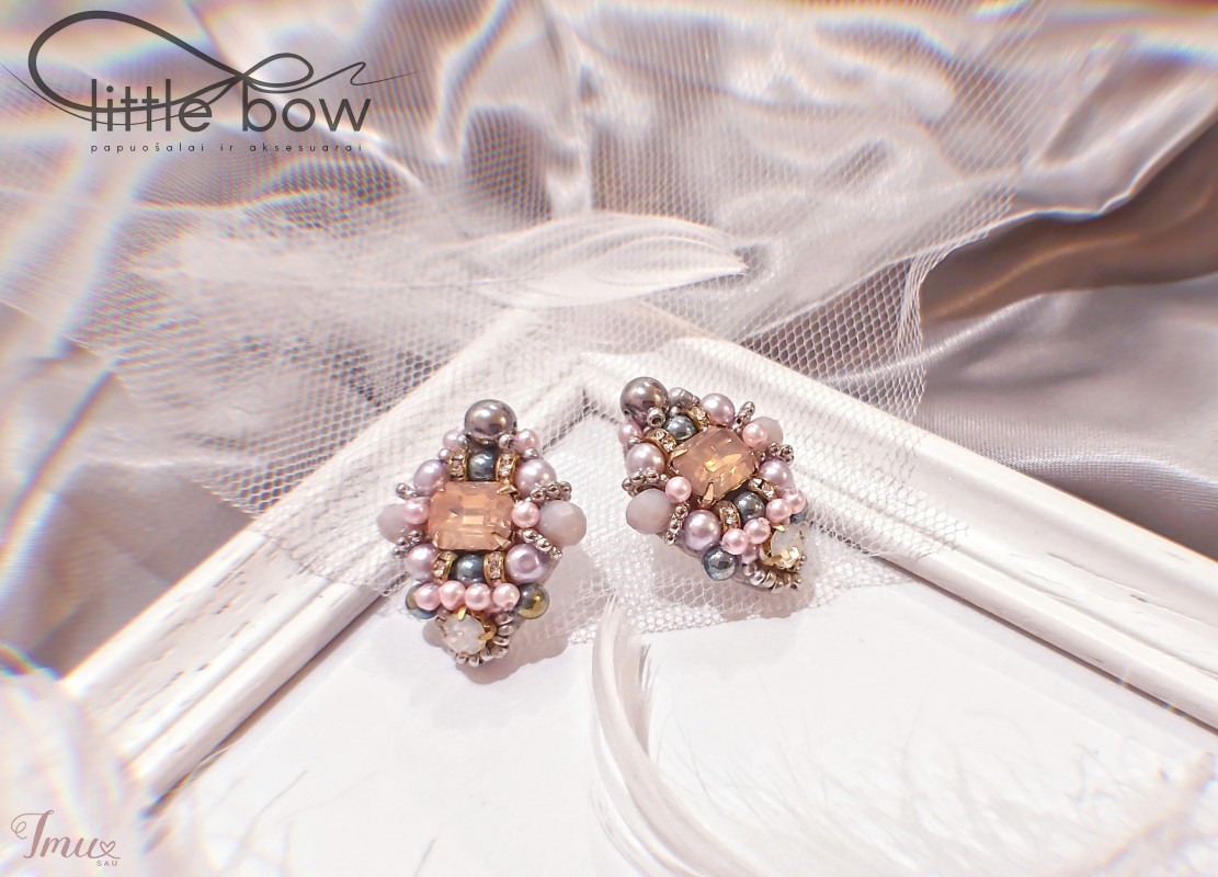 Siuvinėti, originalaus dizaino rankų darbo auskarai. Kristalai, biseris, stiklas, sidabro spalvos detalės.
