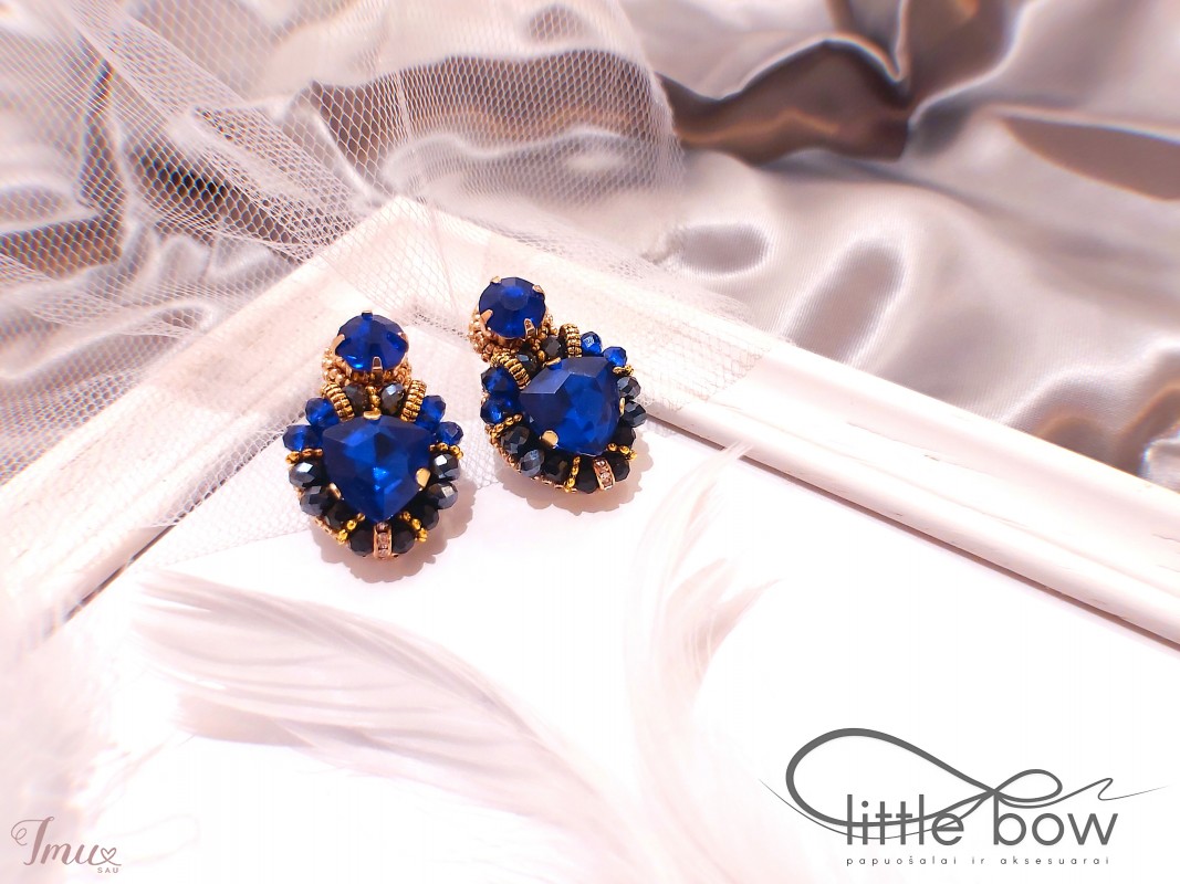 Siuvinėti, originalaus dizaino rankų darbo auskarai. Kristalai, biseris, stiklas, aukso spalvos detalės