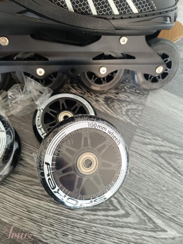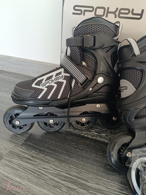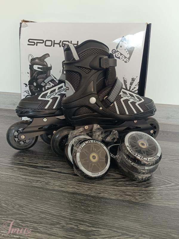 Riedučiai,naudoti 2kartus,pirkti nauji,dydis reguliuojasi 38-42. Yra papildomi ratukai