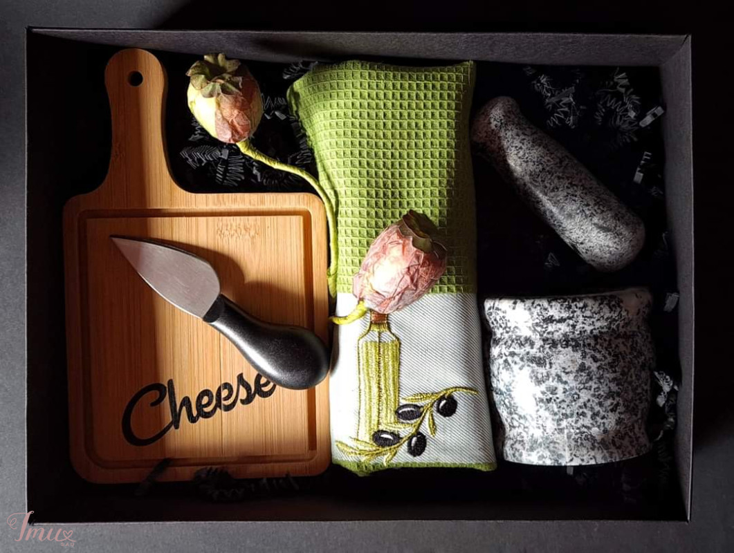 Siunčiama ir į kitus miestus. Dėžutėje rasite: Speciali medinė pjaustymo lentelė ir peilis sūriui. 100% medvilnės virtuvės rankšluostukas. Akmens masės grūstuvė prieskoniams.