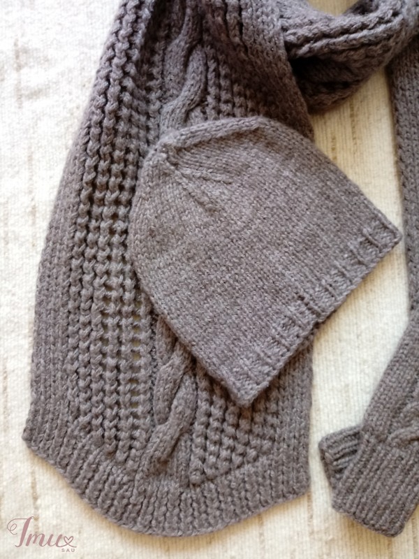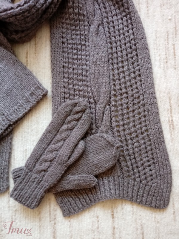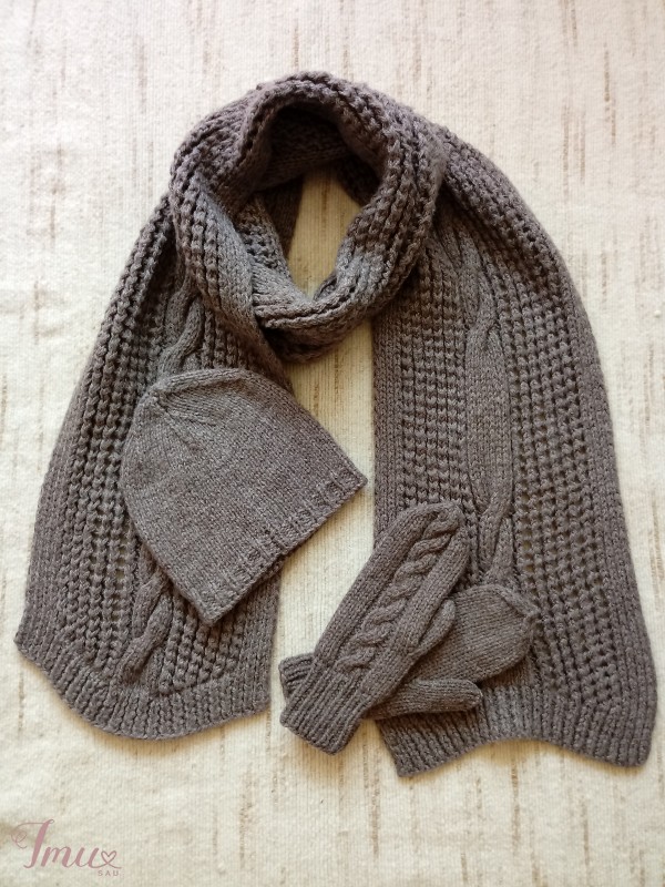 Komplektas - rudas šalikas, kepurė ir pirštinės. Sudėtis - pusvilnė. Šiltas, tamprus, rankų darbo. Šaliko išmatavimai ramybės būsenoje 233 x 25 cm. Skalbti rankomis.