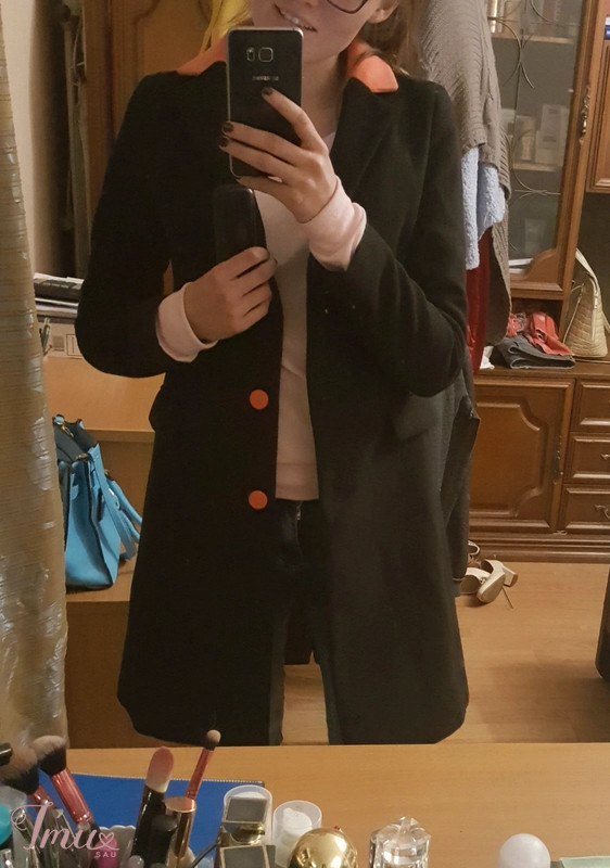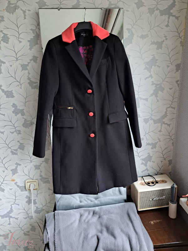 Dėvėtas kelis kartus, turi kišenes, oranžinės spalvos apykaklė. 80%vilna
