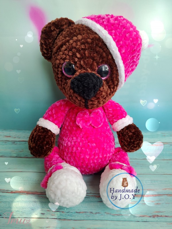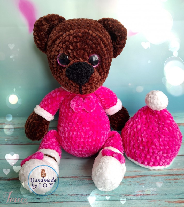 Letenėlės įsiūtos, juda į visas puses, sėdi, stovi. Kepurėlė nusiima. Aukštis 26cm. Verpalai: pliušinis veliuras. Užpildas: poliesteris. Pižama gali būti bet kokios spalvos. Galima išsiūti inicialus arba metriką.