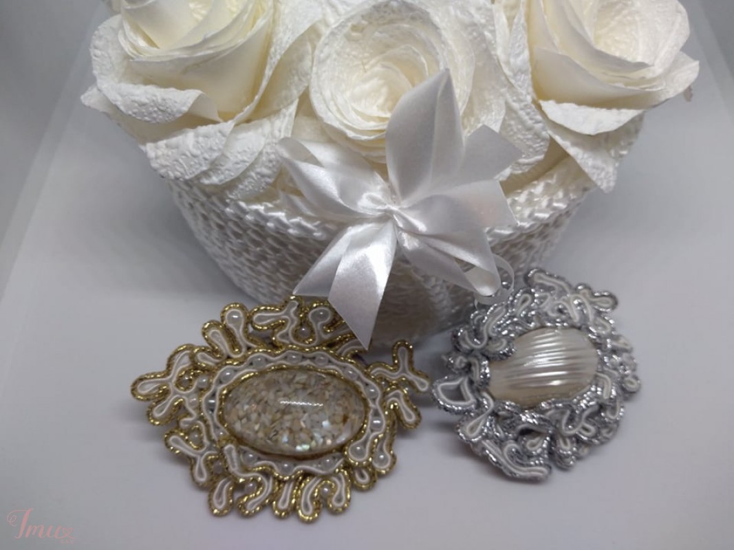 Rankų darbo balta sagė su sidabrinės ar auksinės spalvos intarpu