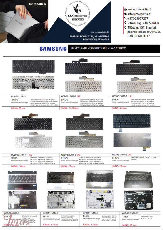 SAMSUNG nešiojamų kompiuterių dalys / klaviatūros pigiausiai SAMSUNG nešiojamų kompiuterių klaviatūros geriausia kaina! Nurodyti ne visi modeliai. Pristatymas visoje Lietuvoje per 1-2 d.d. (DPD kurjeriu, paštomatu, paštu, galima atsiimti vietoje). Visa konsultacija, remonto darbų užsakymas: +37063977277 / info@marsietis.lt / Vilniaus 230, Šiauliai Daugiau informacijos: www.marsietis.lt 1. SAMSUNG R530, NP-R530, NP-R620, RV510, S3510, E352, R538, R540, RV508, E452, NP-RV508, NP-RV510, NP-540, P530, P580, R618, R620, R517, R719, R523, R525, R528, B6F3 PF, R530, R618, R620, R719, E257, E271, E352, E452, NP, NP-E257, NP-E271, NP-E352, NP-E452, NP-P530, NP-P580, NP-R525, NP-R528, NP-R530, NP-R538, NP-R540, NP-R620, NP-R719, NP-RV508, NP-RV510, P530, P580, R519, R525, R528, R530, R538, R540, R620, R719, RV508, RV510, NP-R610, R610MA0SN 0U, BA5902833, CNBA5902833, 9Z.N5LSN.00U, CNBA5902833ABI, NSK-MA0SN, V106360GS1 klaviatūra. Kaina 20 eur. 2. SAMSUNG NP300V5A, NP305V5A, NP300E5A, NP300E5C, NP300E7A, 305V4A, 300E5A, 305E5A, 305E4A, 300V5A, 305V5A, 300E7A, 300E4A, 300V4A, NP300E5Z, NP300E5X, NP300E5C, NP300E5A NP3530EC, 300E, 300E5A, 300E5C, 300E5X, 300E5Z, 300V, 300V5A, 300V5Z, 305E, 305E5A, 305E5Z, 305V, 305V5A, 305V5Z, 310E, 310E5C, 3530EC, NP300E5A, NP300E5AH, NP300E5AI, NP300E5C, NP300E5X, NP300E5Z, NP300E5ZH, NP300E5ZI,NP300V5A, NP300V5AH, NP300V5AI, NP300V5Z, NP300V5ZH, NP300V5ZI, NP305E5A, NP305E5AH, NP305E5AI, NP305E5Z, NP305V5A, NP305V5AD, NP305V5AH, NP305V5AI, NP305V5Z, NP305V5ZD, NP305V5ZI, NP310E5CMC3SN 01, 9Z.N5QSN.30U, BA59-03114A, BA5903114A, BA59-03185A, BA5903185A, BA59-03075c, V127760CK1, V127760AS1, 9Z.N5QSN.20R, 9Z.N5QSN.30U, MD3SN, 9Z.N5QSN.101, 9Z.N5QSN.10U, 9Z.N5QSN.301, 9Z.N6ASN.301, CNBA5903075ABIH, MC1SN klaviatūra US / UK. Kaina 16.90 eur. 3. SAMSUNG NP300E5E, NP350E5C, NP350V5C, NP355E5C, NP355V5C, NP300E5E, NP275E5E, NP300V5A, NP305V5A, 305V4A, 305E4A, 300E5A, NP300E5A, 300V5A, 305E5A, 300V5A, 305V5A, 300E4A, 300V4A, NP365E5C, NP550P5C, NP270E5V, NP300E5E, NP350E5C, 300E5E, NP350V5C, 300E5E, 355E5, NP270E5J, NP275E5E, NP270B5E,NP270E5U, 350E7C, 355E7C, NP350E7C, NP355E7C, 270E5E, 270E5G, 270E5V, 275E5E, 275E5V, 300E5E, 300E5V, NP270E5E, NP270E5G, NP270E5V, NP275E5E, NP275E5V, NP300E5E, NP300E5V, 350E5C, 350E5X, 350E7X, 350V5C, 355E5C, 355E5X, 355V5C, 355V5X,550P7C, NP350E5C, NP350E5X, NP350E7X, NP350V5C, NP350V5X, NP355E5C, NP355E5X, NP355V5C, NP355V5X, NP550P5C, 550P5C, 370R5E, 370R5V, 510R5E, NP370R5E, NP370R5V, NP510R5E, 270E5R, NP270E5R, NP355V5L, NP300E5E, NP350V5C,9Z.N4NSN, 9Z.N4NSN.00, 9Z.N4NSN.001, 9Z.N4NSN.00F, 9Z.N4NSN.00G, 9Z.N4NSN.01D, BA59-03271A, BA59-03271F, BA75-03738A, BA59-03270F, BA75-04303A, PK130TZ2A00, V138502AS klaviatūra. Kaina 18 eur. 4. SAMSUNG 530U4B, 530U4C, 535U4B, 535U4C, NP530U4B, NP530U4C, NP535U4B, NP535U4C, BA59-03259A, CNBA5903259ABYNF, CNBA590326, CNBA5903260, MP-12F1 klaviatūra. Kaina 24.00 eur. 5. SAMSUNG NP300V5C, NP300V5A, NP305V5A, 300V5A, NP300V5A, 305V5A, BA75-03246C, BA75-03318A, BA75-03250A, ba75-03215d klaviatūra su dangčiu, palmrest. Kaina 65 eur. 6. Samsung 300E, 300E5A, 300E5C, 300E5X, 300E5Z, 300V, 300V5Z, 305E, 305E5A, 305E5Z, 305V, 305V5A, 310E5C, 3530EC, NP300E5A, NP300E5AH, NP300E5AI, NP300E5C, NP300E5X, NP300E5Z, NP300E5ZH, NP300E5ZI, NP300V5Z, NP300V5ZH, NP300V5ZI, NP305E5A, NP305E5AH, NP305E5AI, NP305E5Z, NP305V5A, NP305V5AD, NP305V5AH,NP305V5AI, NP305V5Z, NP305V5ZD, NP305V5ZH, NP305V5ZI, NP310E5C, NP3530ECMC3SN 01, MD3SN9Z.N5QSN.101, 9Z.N5QSN.10U, 9Z.N5QSN.301, 9Z.N6ASN.301, CNBA5903075ABIH, MC1SN klaviatūra su dangčiu. Kaina 67 eur. 7. Samsung NP, NP-RV511, NP-RV515, NP-RV520, RV511, RV515, RV520, BA75-02862C, BA75-02862D, BA59-02941D, BA75-02862A klaviatūra su dangčiu, palmrest. Kaina 67 eur. 8. SAMSUNG SF510, NP-SF511, SF511, BA75-02713E, BA81-11135A, 9Z.N5QSN.A06. Kaina 67 eur. Visa konsultacija, remonto darbų užsakymas: +37063977277 / info@marsietis.lt / Vilniaus 230, Šiauliai Daugiau informacijos: www.marsietis.lt SAMSUNG nešiojamų kompiuterių dalys / klaviatūros pigiausiai