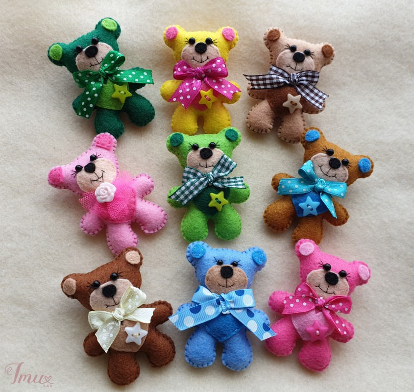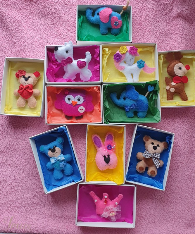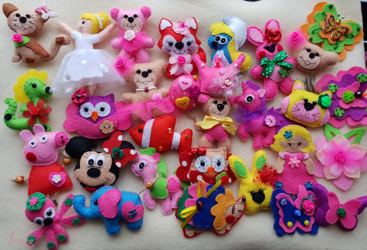 Iš veltinio. Dydis apie 6.5 cm. Viskas susiūta rankomis, papuošta įvairiomis smulkiomis detalėmis. Turi užsegimą. Tinka segti į drabužėlius. Puikus papuošaliukas vaikučiams.