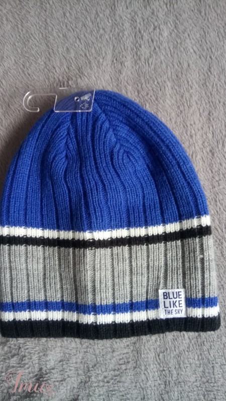 Dviguba šilta kepurė, priekis mėlyna su pilkais, vidus juodas, apimtis 42-44 cm, sudėtis 100% akrilas.