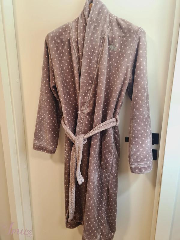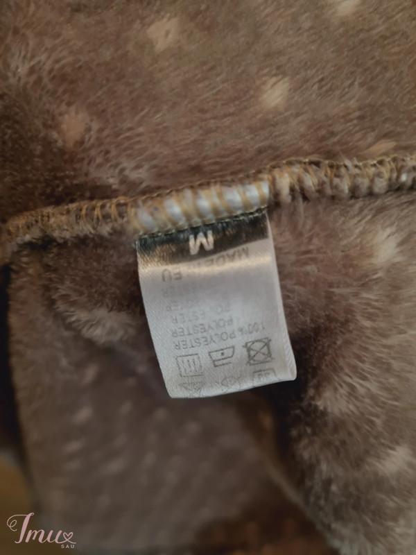 Šiltas minkštas jaukus L&L chalatas. Sukišenėmis, susiaučiamas ir surišamas dirželiu, aukštesne apykakle. M dydis. Apimtis ties krūtine, liemeniu, klubais ~108cm, rankovės nuo pažasties ilgis ~47cm, chalato ilgis ~112cm. Chalato spalva - kakavinė su rožiniais bumbuliukais. Chalatas atrodo gerai, kokybiškas, vilkėtas, mylėtas. Labai malonus vilkėti. Sudėtis: 100% poliesteris.