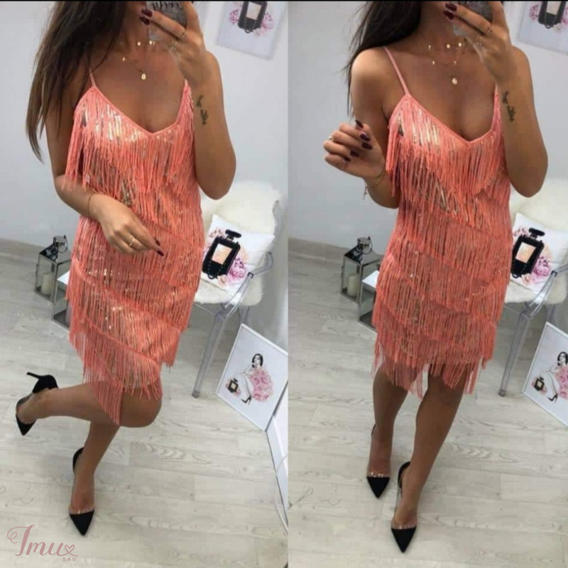 Nauja. Atvira nugara ir krūtinė.Ant petnešėlių.Siūlinė, krintanti.Apatinė dalis blizgi.Spalva rausva