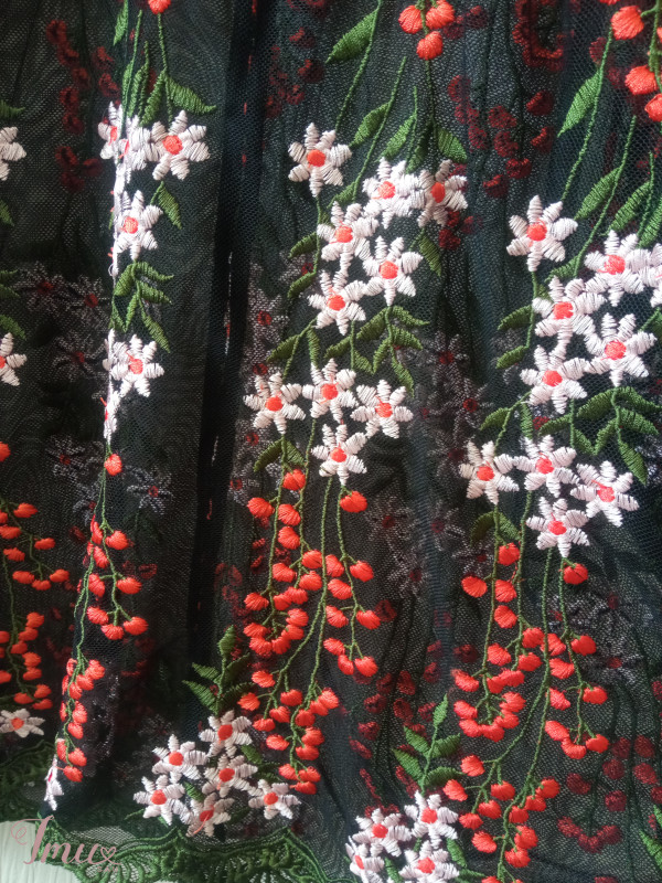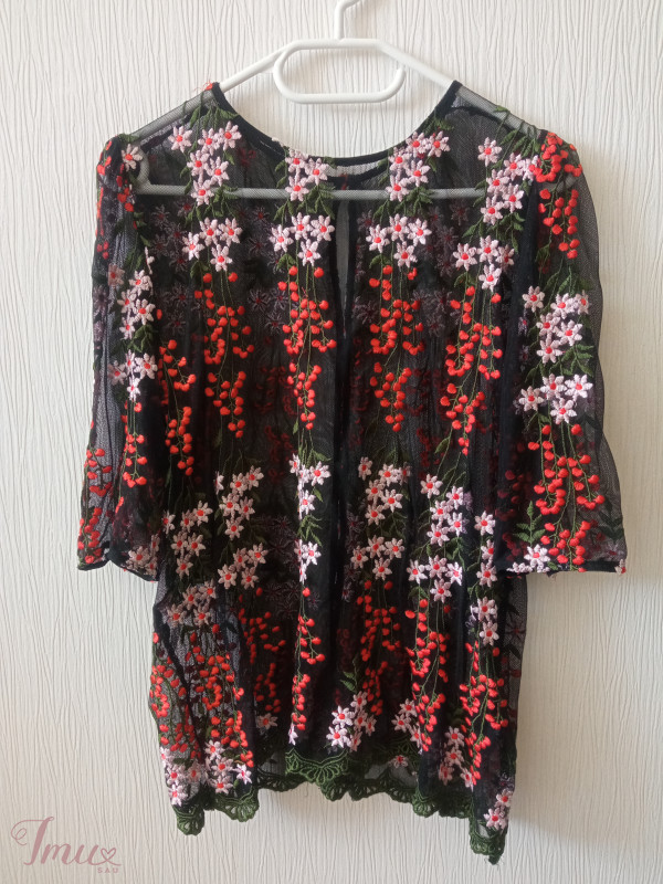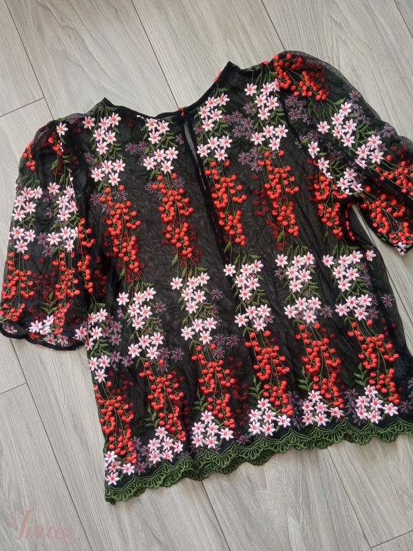 Gėlių motyvais siuvinėta, juoda permatoma palaidinė. Ilgis nuo peties 61 cm, plotis 52 cm