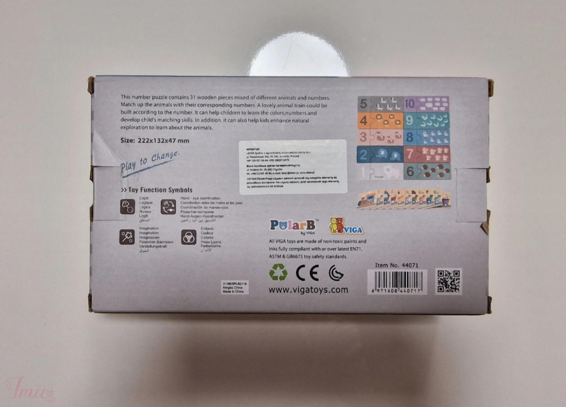 Naudota, bet būklė puiki. Parduodama su dėžute. Rinkinį sudaro 31 medinė lentelė ant kurių matomi įvairūs gyvūnai ir skaičiai. Vaiko užduotis sudėti gyvūnus su atitinkamais skaičiais. Moko loginio mąstymo, skaičių, lavina smulkiąją motoriką.