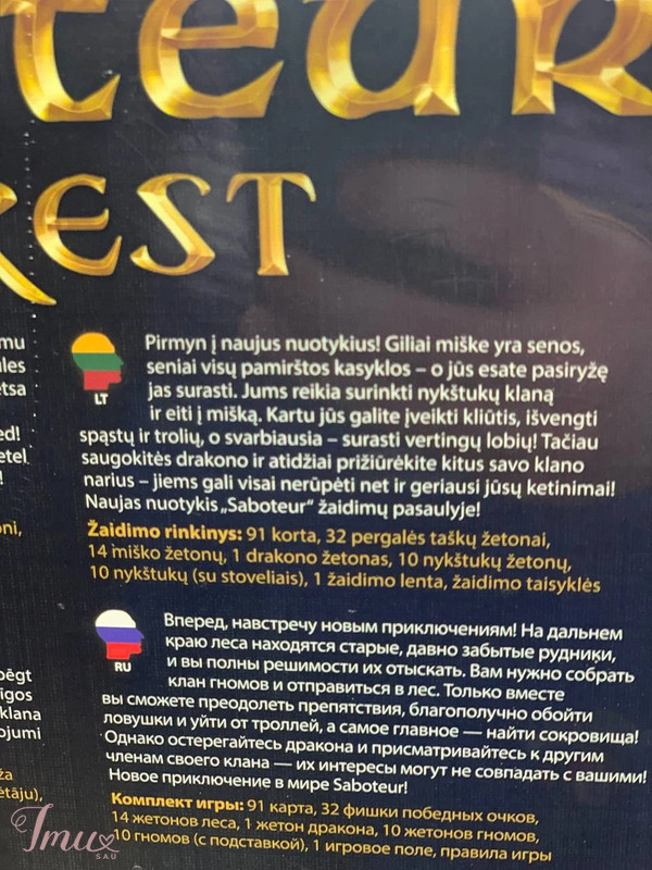 Saboteur Forest stalo zaidimas Pirmyn į naujus nuotykius! Giliai miške yra senos, seniai visų pamirštos kasyklos — o jūs esate pasiryžę jas surasti. Jums reikia surinkti nykštukų klaną ir eiti į mišką. Kartu jūs galite įveikti kliūtis, išvengti spąstų ir trolių, o svarbiausia — surasti vertingų lobių! Amžius: nuo 10 metų Žaidimo trukmė: 30-60 minučių Žaidėjų skaičius: 3-9