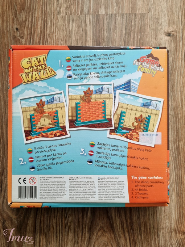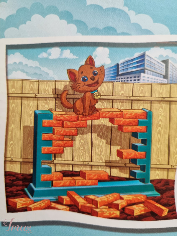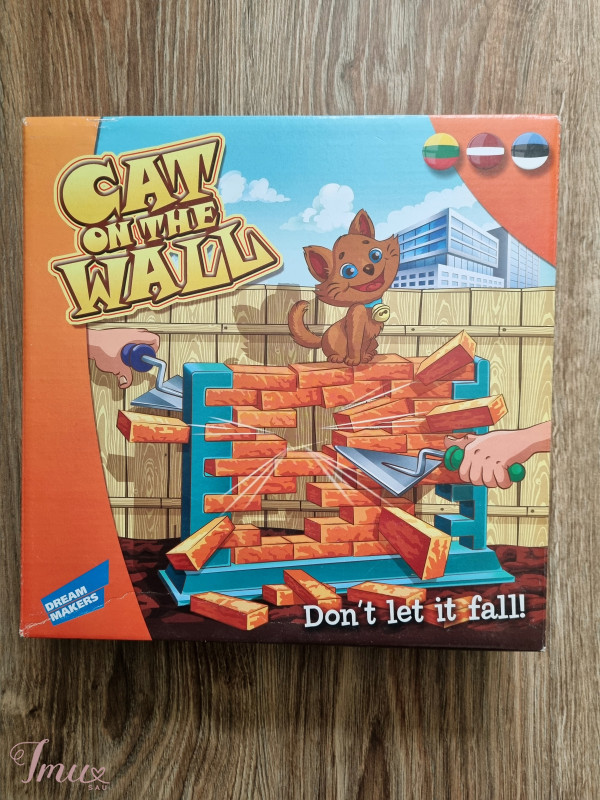 Linksmas stalo žaidimas "Cat on the wall" tinka įvairioms kompanijoms, nepriklausomai nuo amžiaus. Žaidimo tikslas: Pastatyti plytų sieną ir ant jos pasodinti katę. Mentelių pagalba ardyti sieną. Reikia būti atsargiems, nes siena gali sugriūti, o Jūsų tikslas - kuo ilgiau išlaikyti katę ant sienos viršaus. Žaidėjas, kuriam ardant sieną katė nukrito, laikomas pralaimėjusiu. Žaidimas tinkamas žaisti nuo 5 m. Žaidėjų skaičius - nuo 2 iki 4. Žaidimo trukmė - 15 min. 🥰