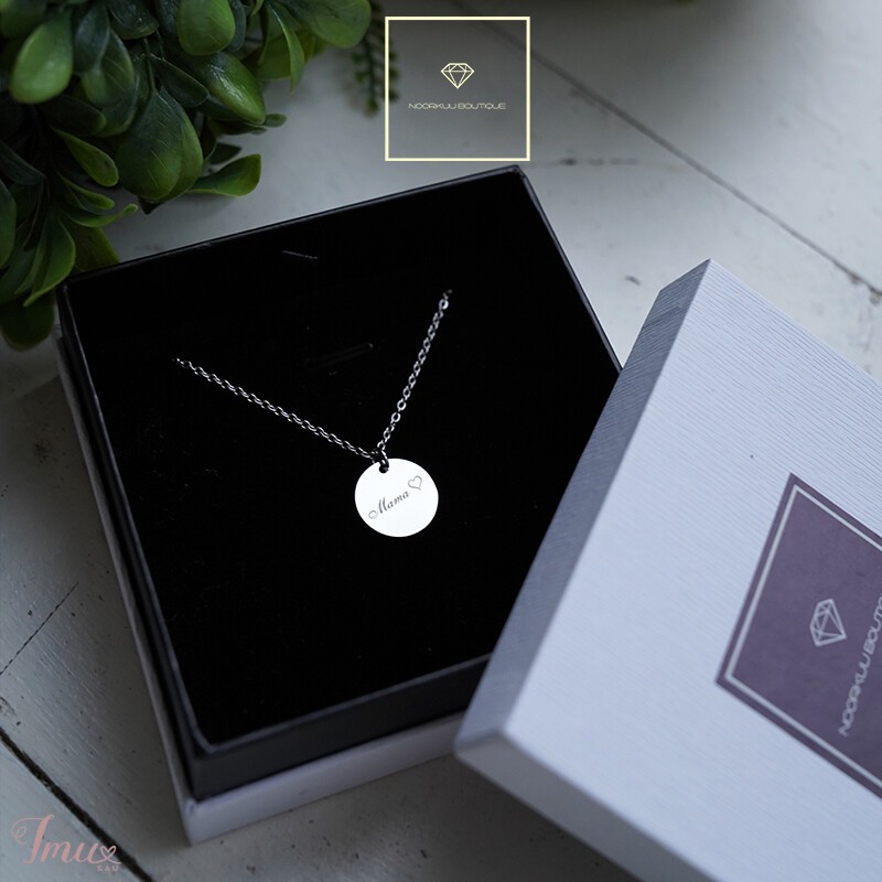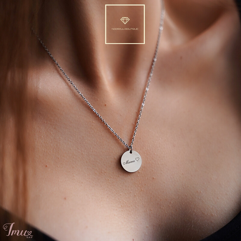 Stilingas pasidabruotas pakabukas su jūsų pageidavimu išgraviruotu tekstu. Reguliuojamas grandinėlės ilgis nuo 45 iki 50 cm. Pakabuko dydis: 1.4cm X 1.4 cm Prekė supakuota į baltos spalvos, gražią, puošnią dėžutę. Brendas Noorkuu boutique https://lt.noorkuuboutique.eu/