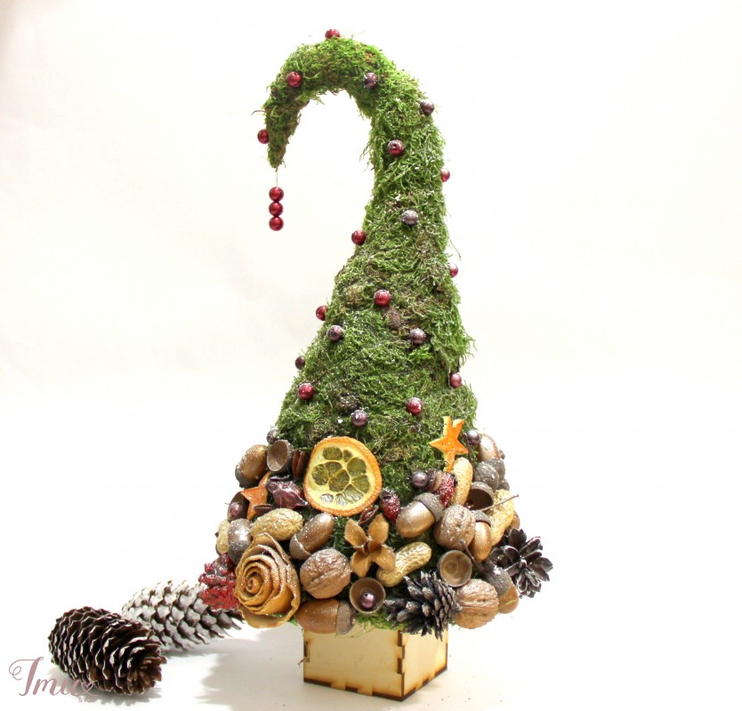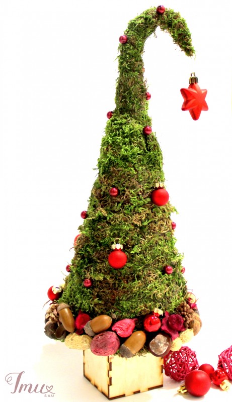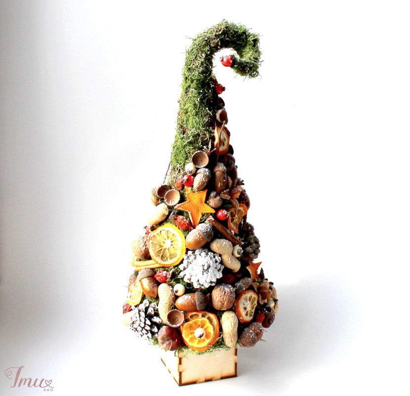 Stilizuota eglutė iš gamtinių medžiagų, panaudojant keletą dirbtinių detalių.Aukštis nuo stalo apie 44 cm.