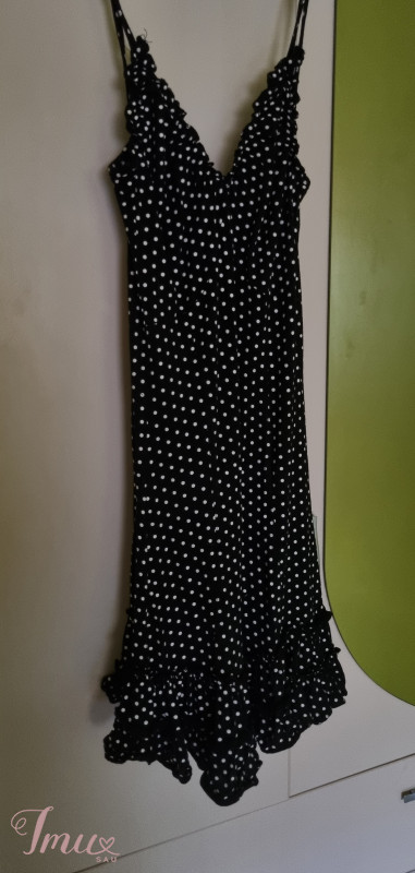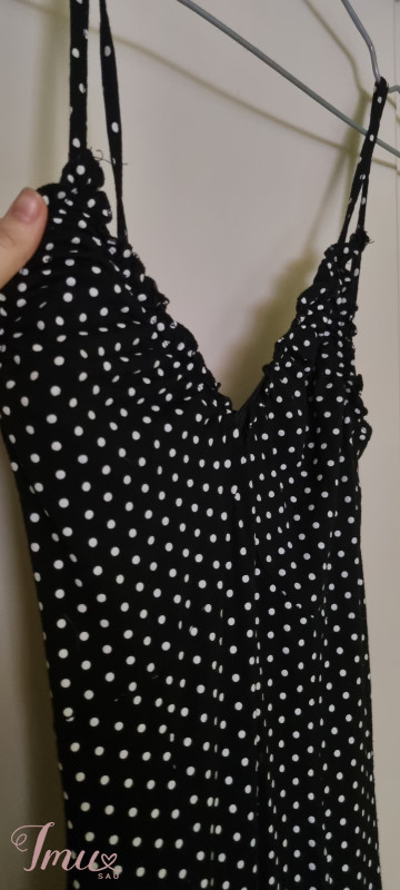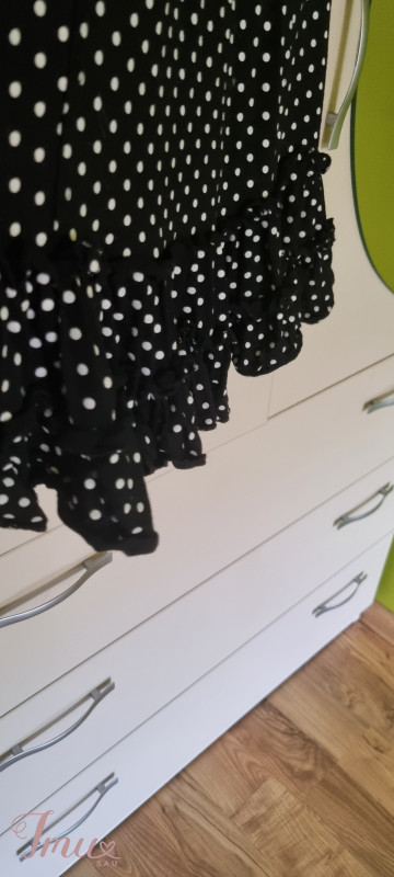 juoda suknelė su baltais žirniukais dydis M/L ties krūtine eina brindutės bei suknelės apačioje brindutės