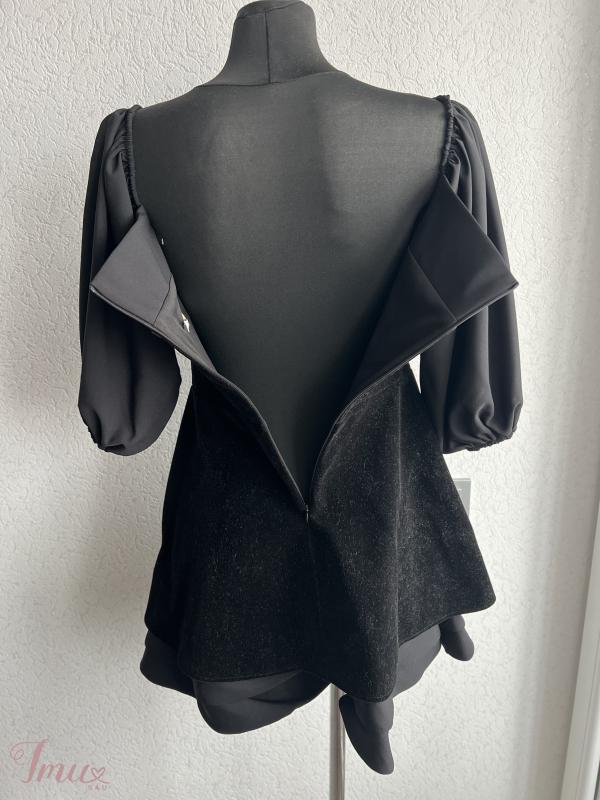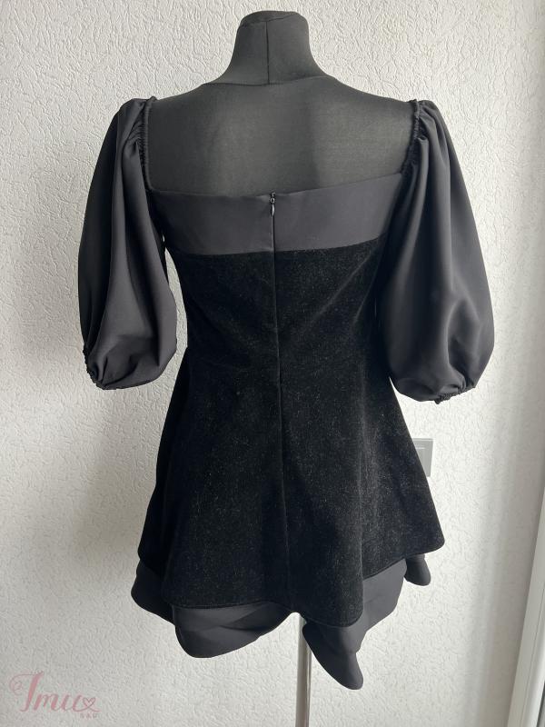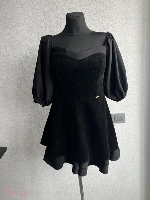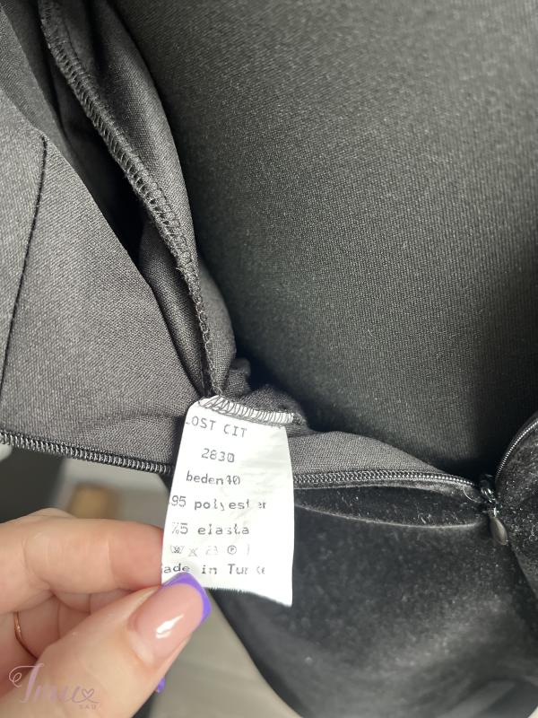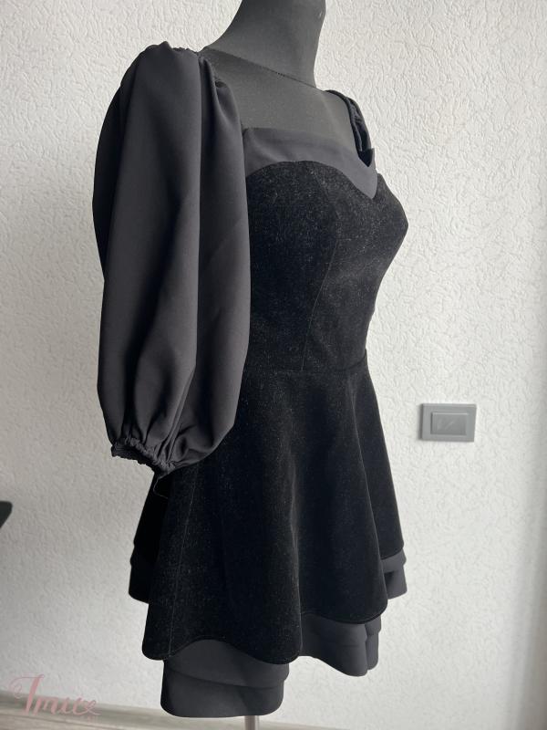 Trumpa juodos spalvos suknelė, užsidėta buvo tik vieną kart per šventė, gale užsisega užtrauktu, rankovės 3/4, dydis parašytas 40, bet labiau M dydžiui, mokėta buvo 100€