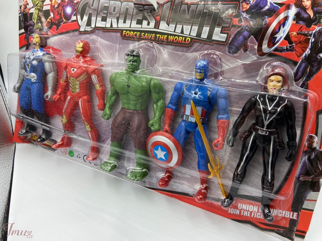 Super herojų figūrėlių rinkinys "Heroes Unite" Mėgsti super herojus? O gal nori nustebinti savo draugą, kuris mėgsta "Keršytojų" filmus? Turime Tau nuostabų pasiūlymą, kuris pradžiugins, bet kurį super herojų gerbėją! *Rinkinyje yra: "Toras"; "Geležinis žmogus"; "Halkas"; "Kapitonas Amerika"; "Juodoji našlė" *Figurėlių aukštis - 16cm
